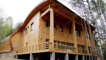 Двухэтажный загородный дом композиционно объединяет разные по функции площади. Под единой крышей соседствуют помещения жилого дома и гараж. Части дома имеют перепад в уровне полов первого этажа и соединены между собой перетекающей с одного объема на другой двускатной по уровню дуги крышей.