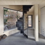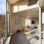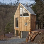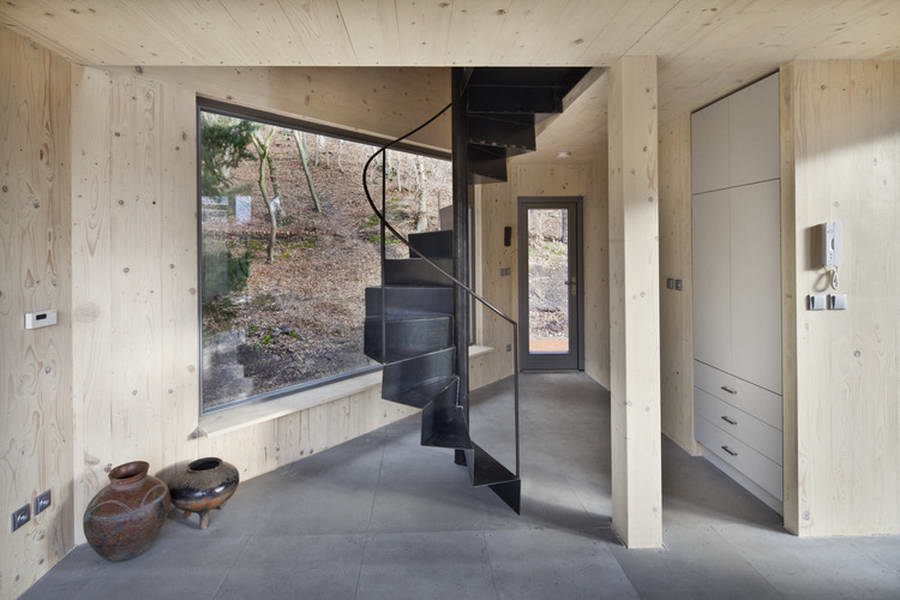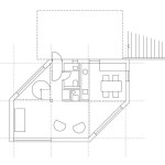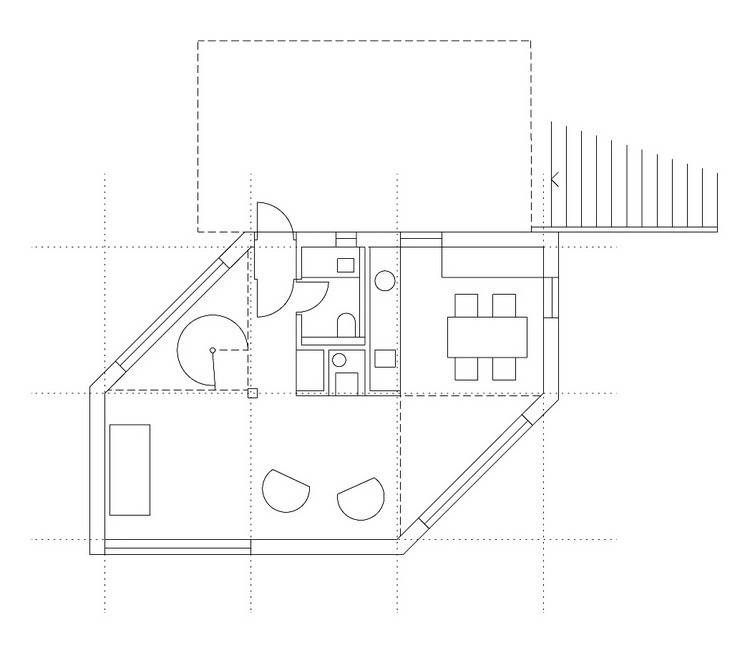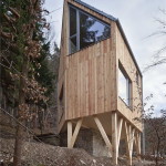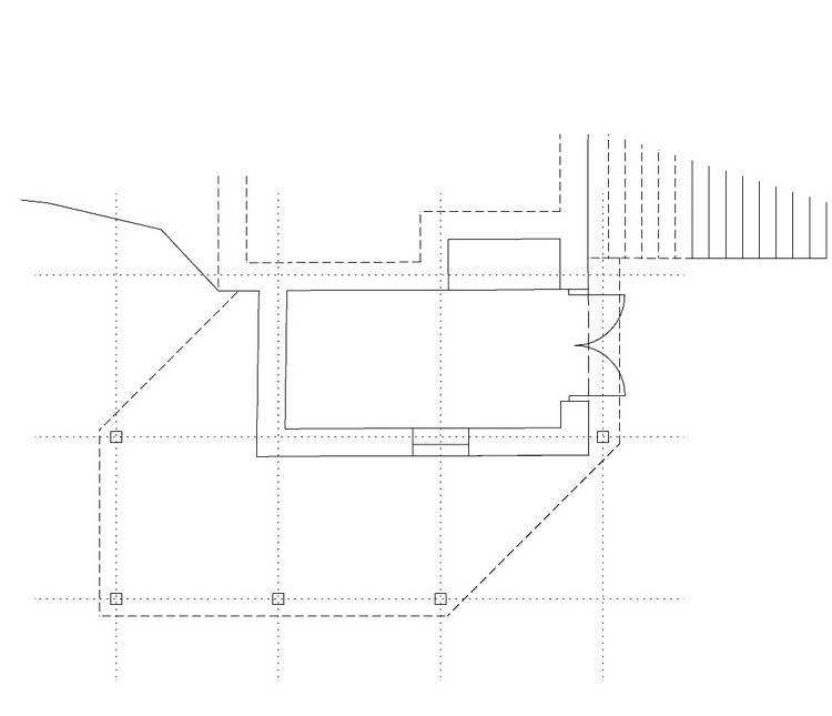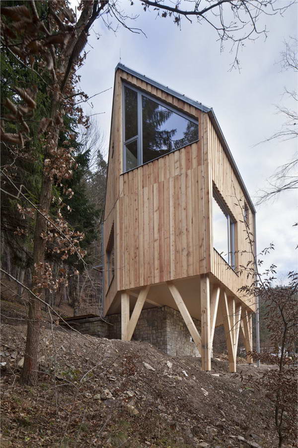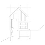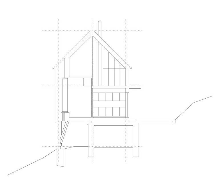 Дом построен на месте старого, практически разрушенного здания. Часть его конструкций была интегрирована в новую постройку (гараж на нижнем уровне). Новый дом частично опирается на старые конструкции, частично на деревянные колонны.