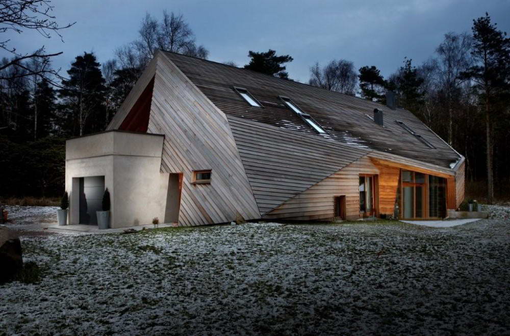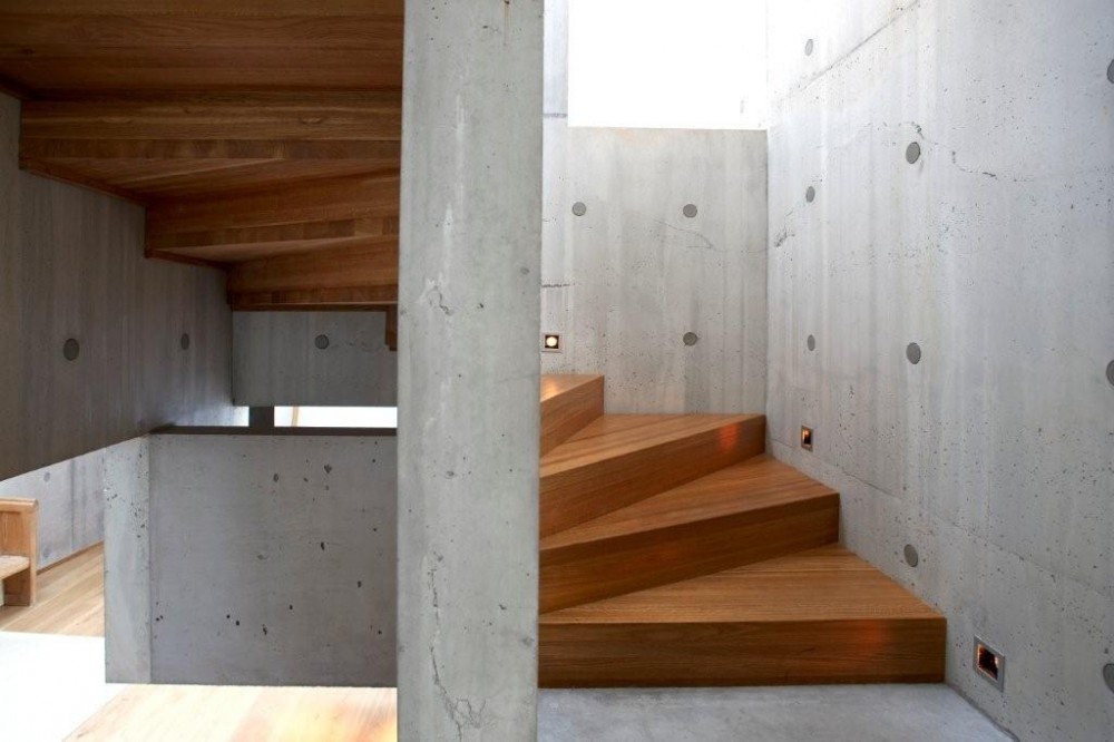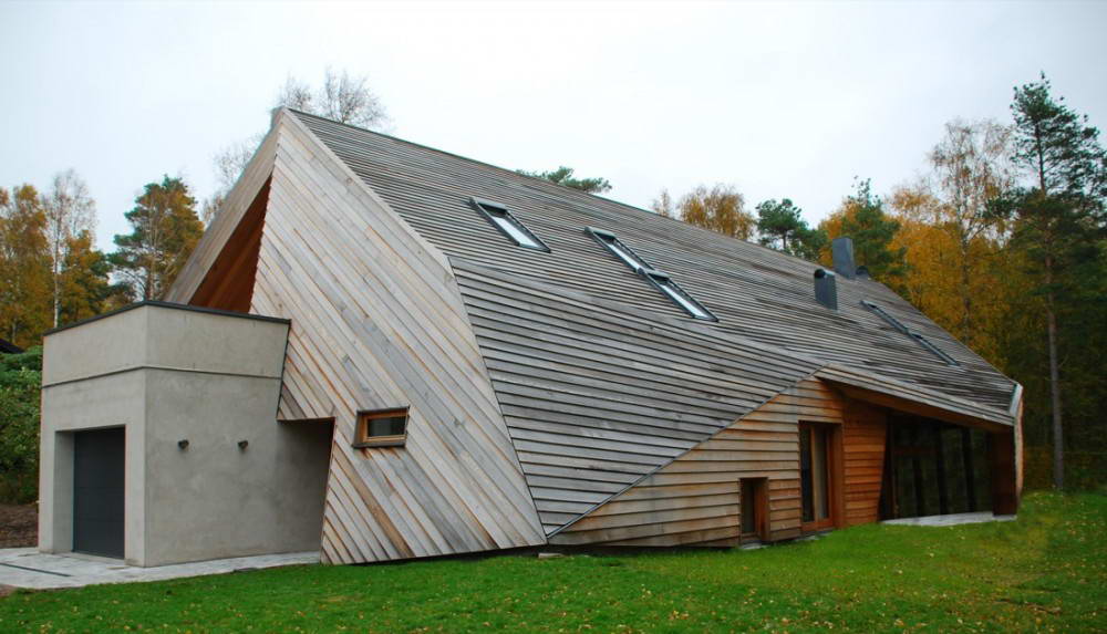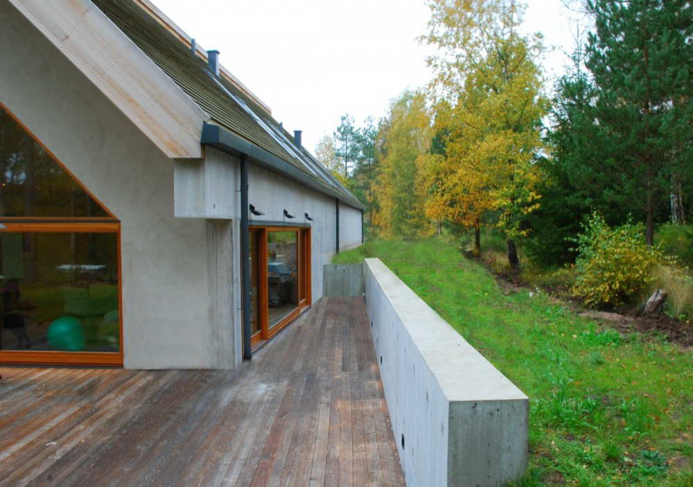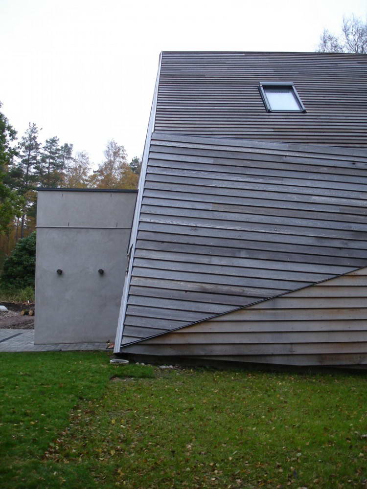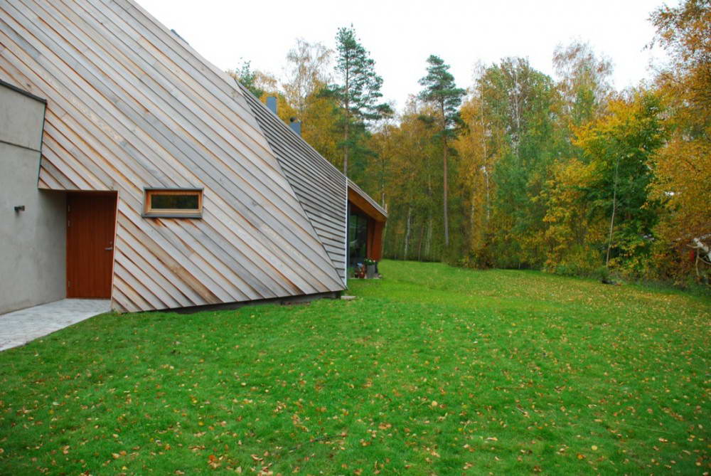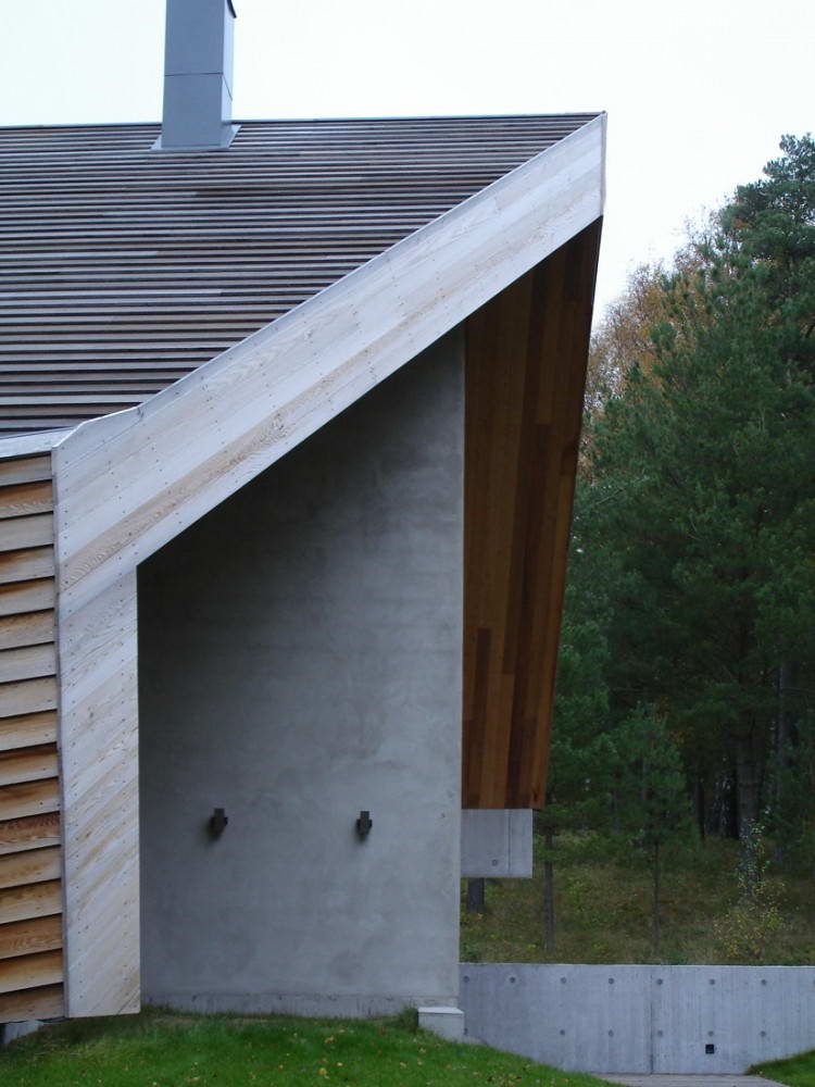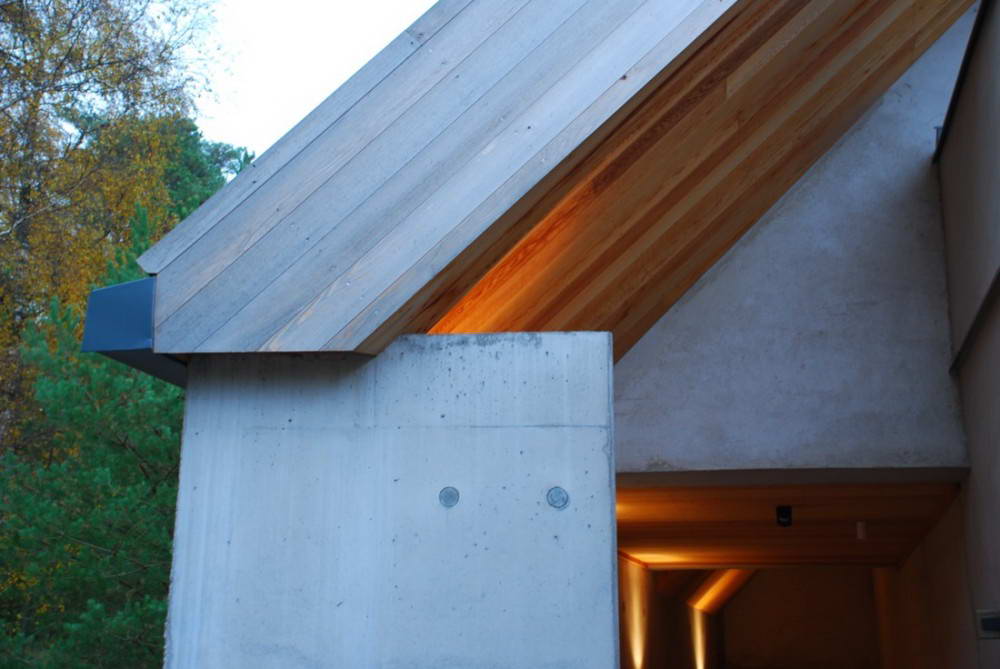 Целью проекта является использование конкретных условий участка для достижения гармонии между природой и домом. Проектирование началось с тщательного анализа ландшафта, топографии участка, изучения сезонных цветовых палитр, солнечного воздействия, розы ветров и видов на окружающий пейзаж. Бетонная несущая конструкция здания акцентируется в решениях интерьера. Снаружи дом плотно заключён в деревянную оболочку.
