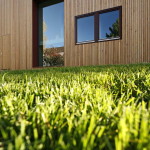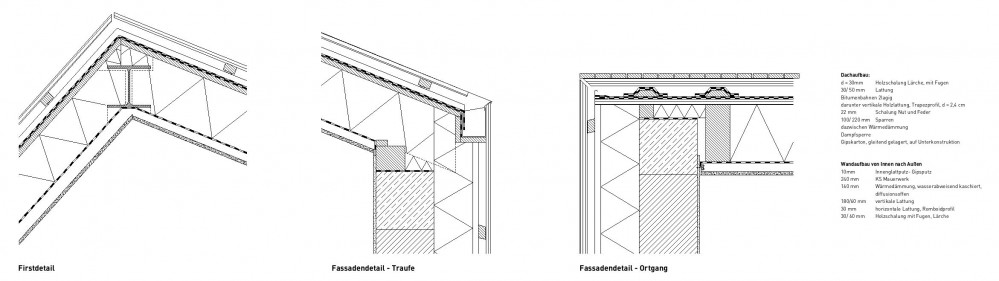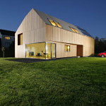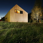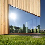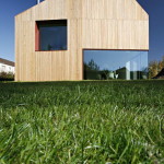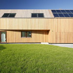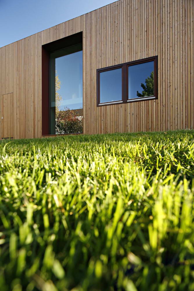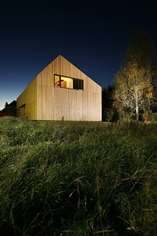 Характерное сельское окружение и близость к природе подсказали решение по отделке фасада — он был полностью «обёрнут» рейкой из лиственницы. В течение времени фасад будет постепенно менять свой цвет, пока не превратится из бежевого в серебристый, а затем в тёмно-серый.