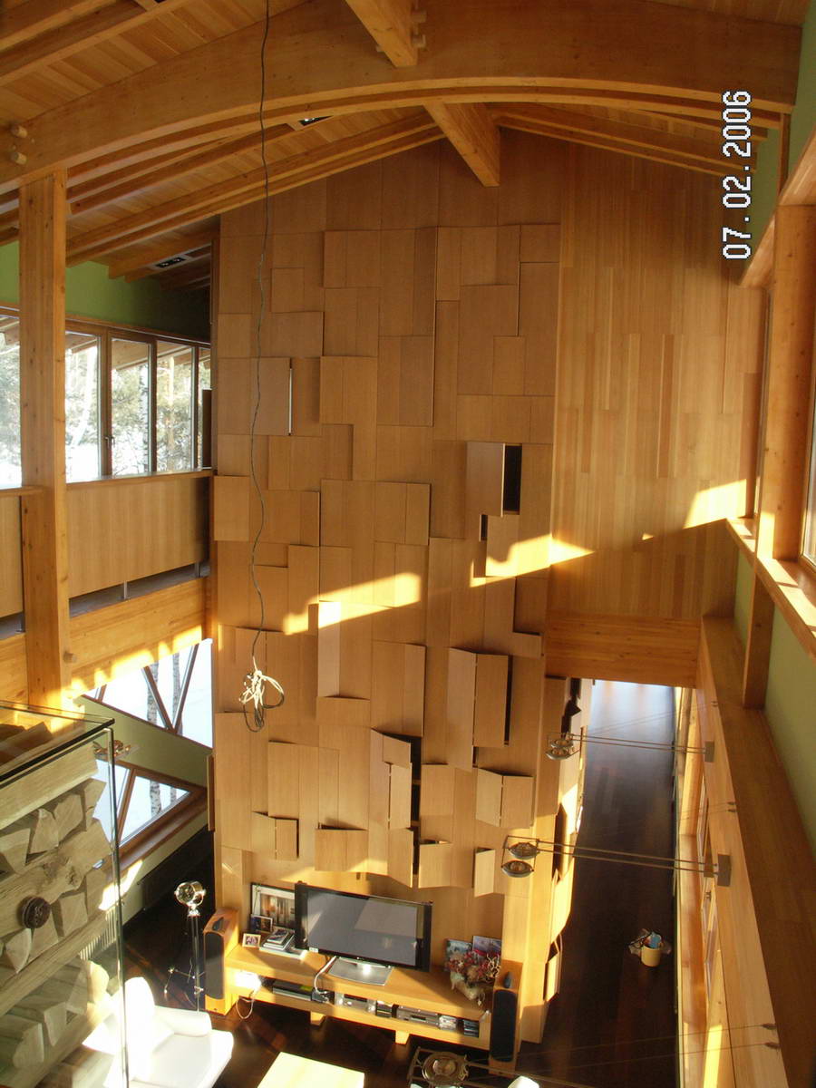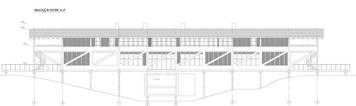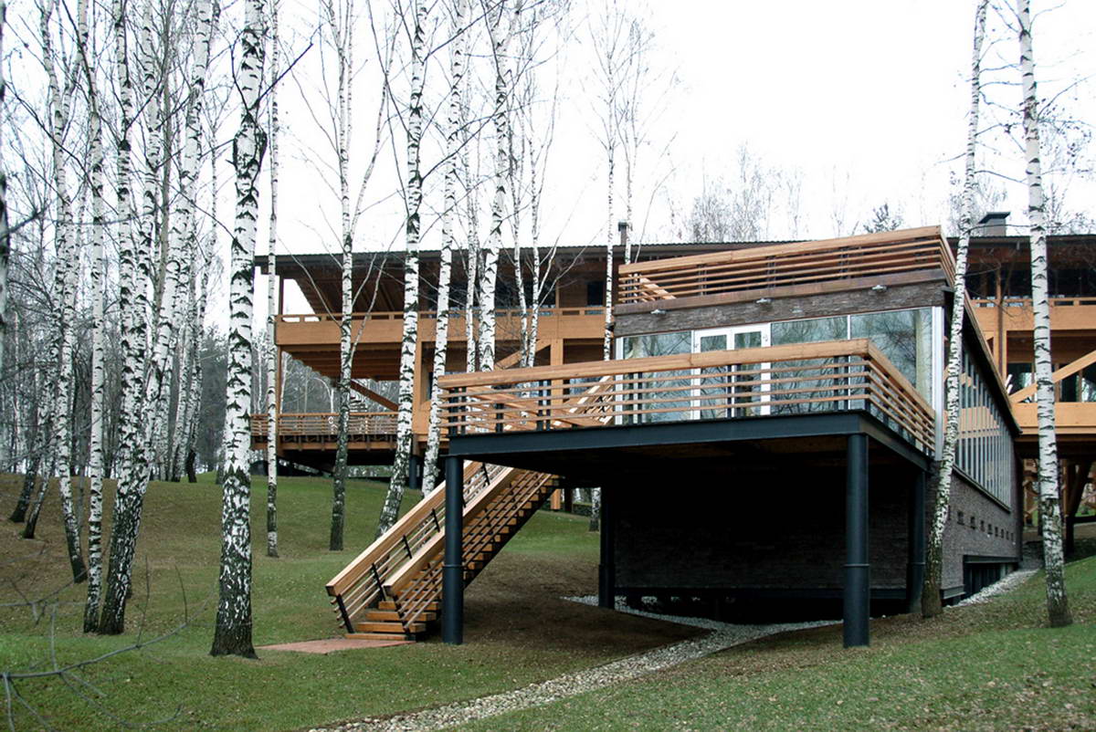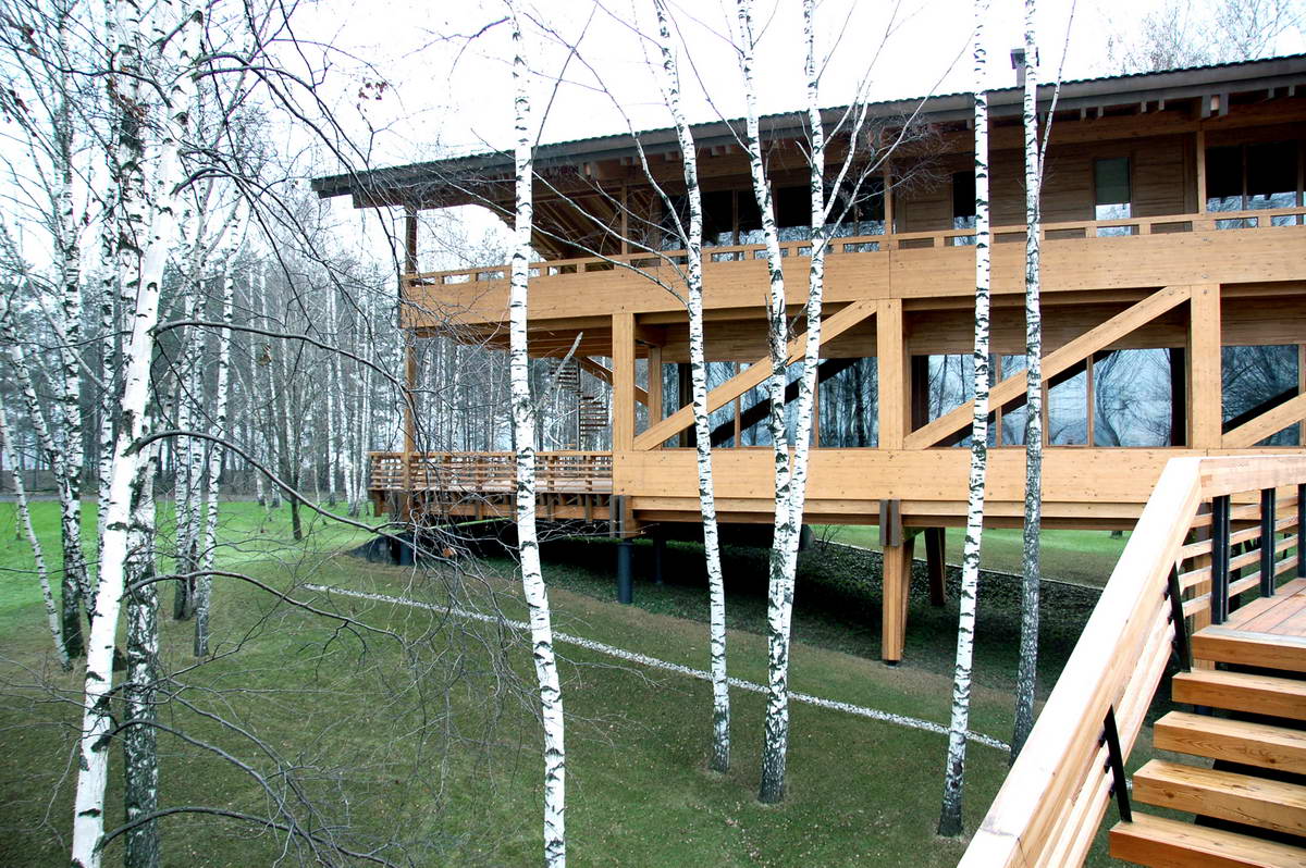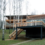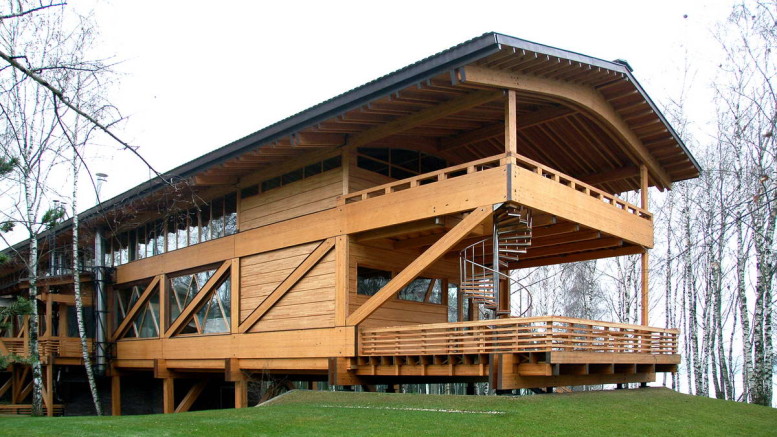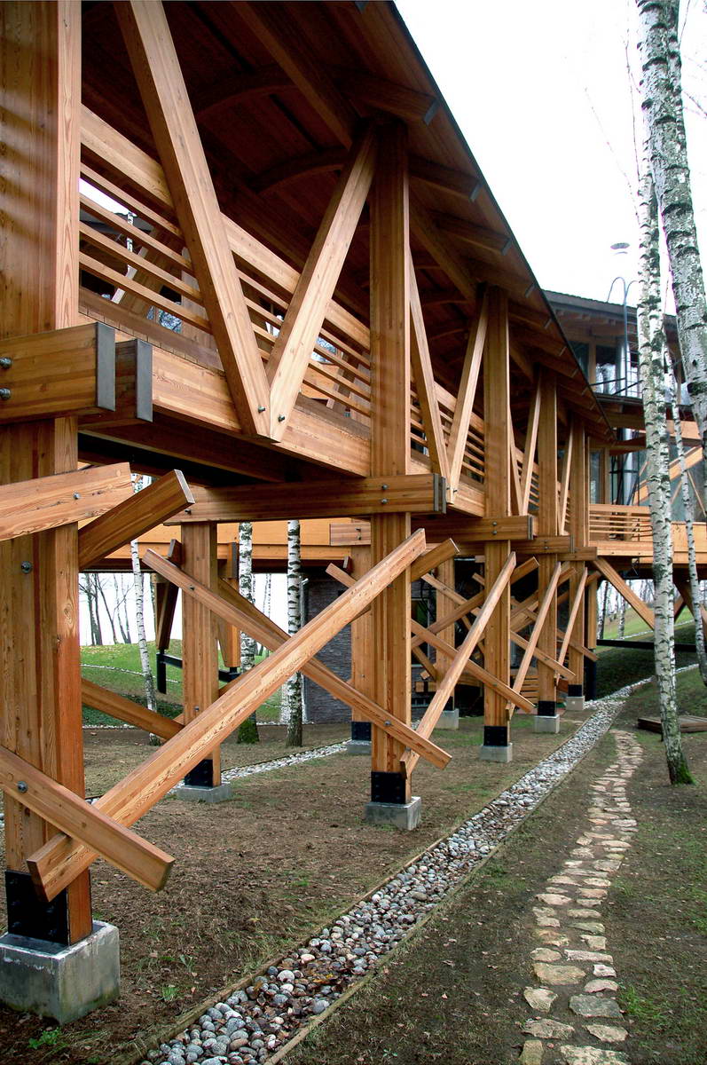 Одна часть дома, верхняя, представляет собой стоечно-балочную схему из клееной древесины лиственницы. Опорой деревянным стойкам служат фундаменты на буронабивных сваях. Шаг стоек по буквенным осям – 6,0 м, по цифровым – 6,5 м и 2,1 м. Общие габариты этой части дома с учётом террас – 60,0х8,6м. Наружные стены – каркас из доски с заполнением минераловатным утеплителем и навесными щитами из клееной лиственницы в качестве наружной отделки. Кровля из доски лиственницы по наслонным клееным стропилам тоже из лиственницы.