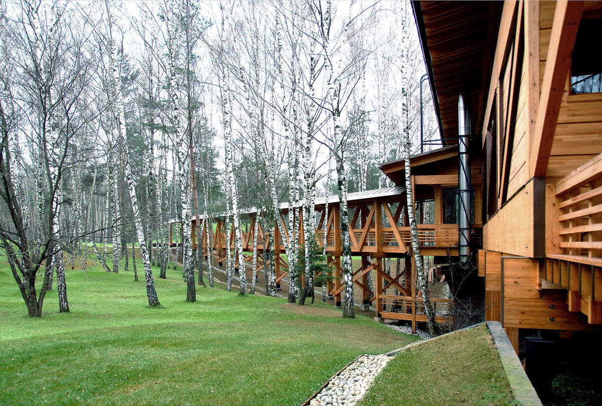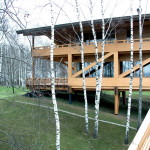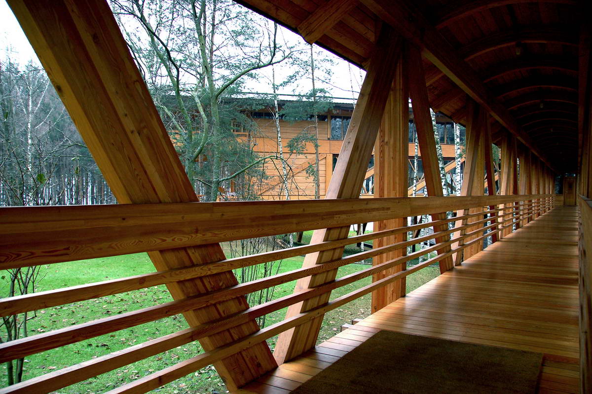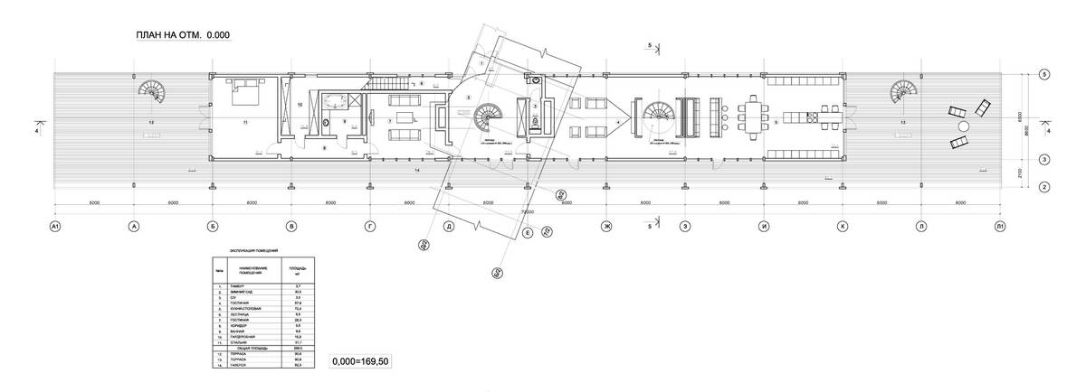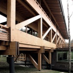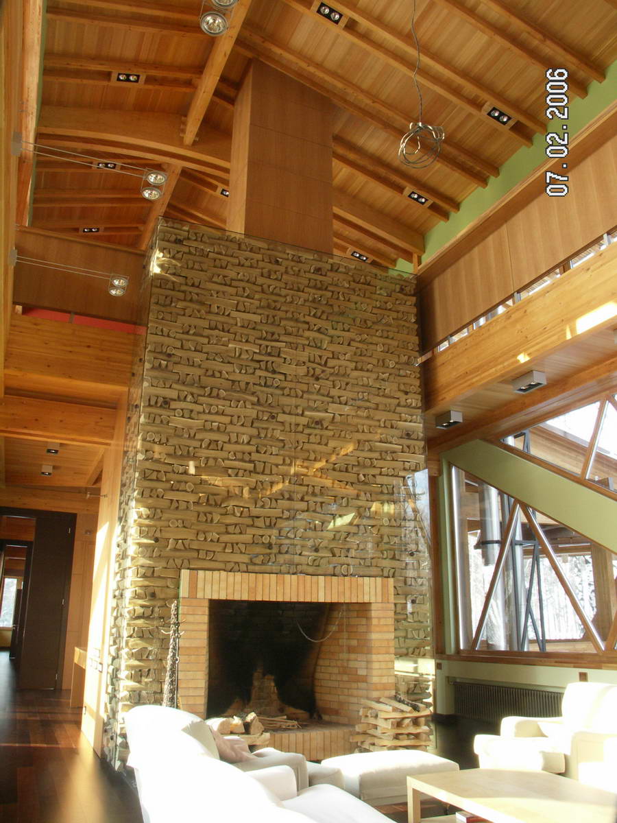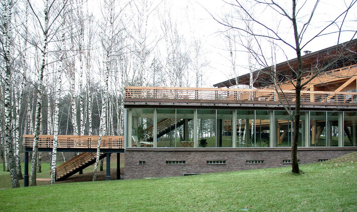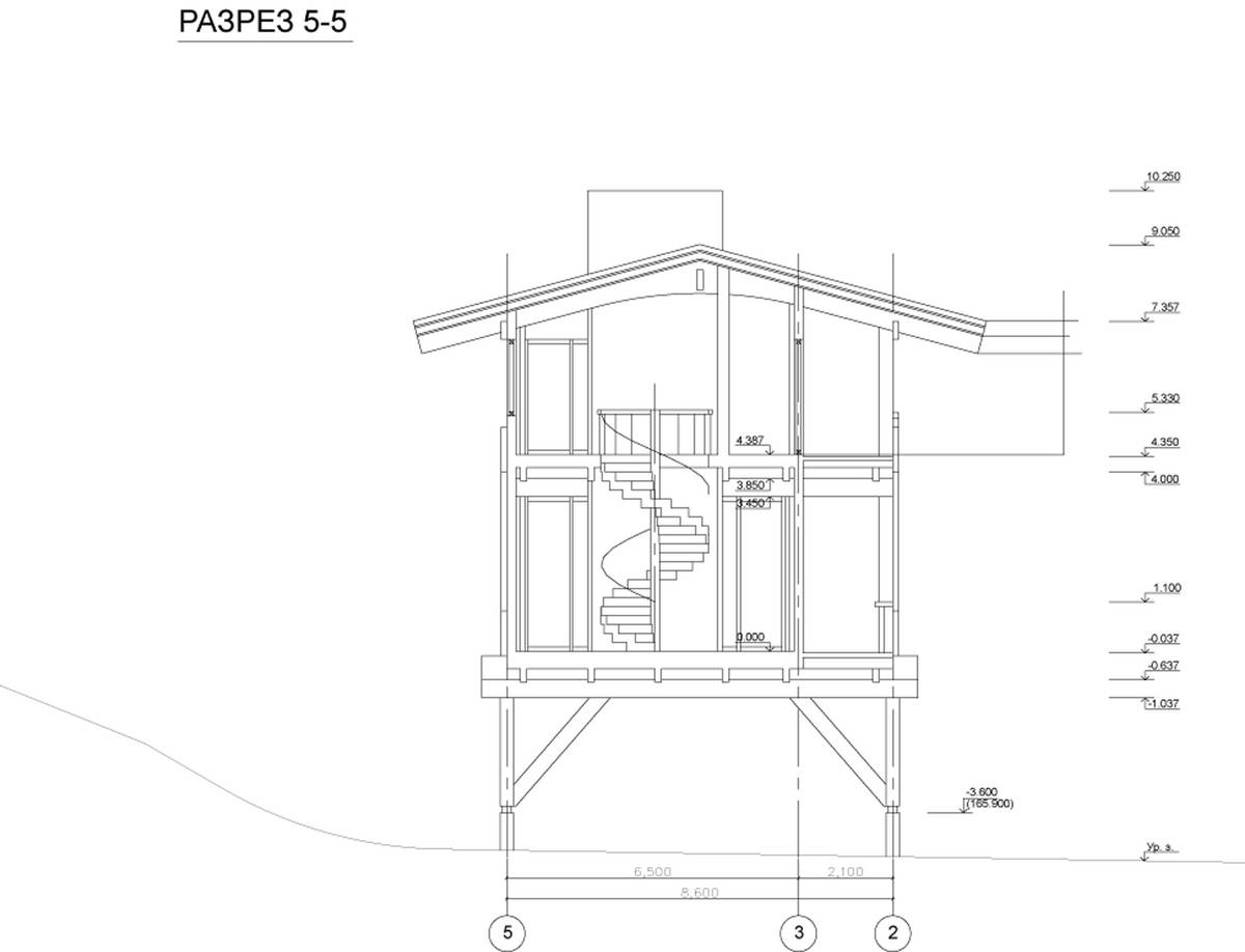 Одна часть дома, верхняя, представляет собой стоечно-балочную схему из клееной древесины лиственницы. Опорой деревянным стойкам служат фундаменты на буронабивных сваях. Шаг стоек по буквенным осям – 6,0 м, по цифровым – 6,5 м и 2,1 м. Общие габариты этой части дома с учётом террас – 60,0х8,6м. Наружные стены – каркас из доски с заполнением минераловатным утеплителем и навесными щитами из клееной лиственницы в качестве наружной отделки. Кровля из доски лиственницы по наслонным клееным стропилам тоже из лиственницы.