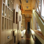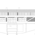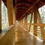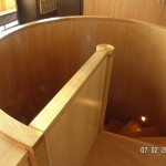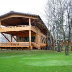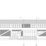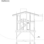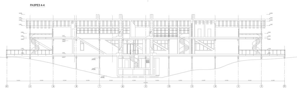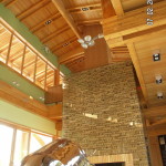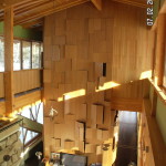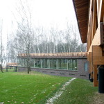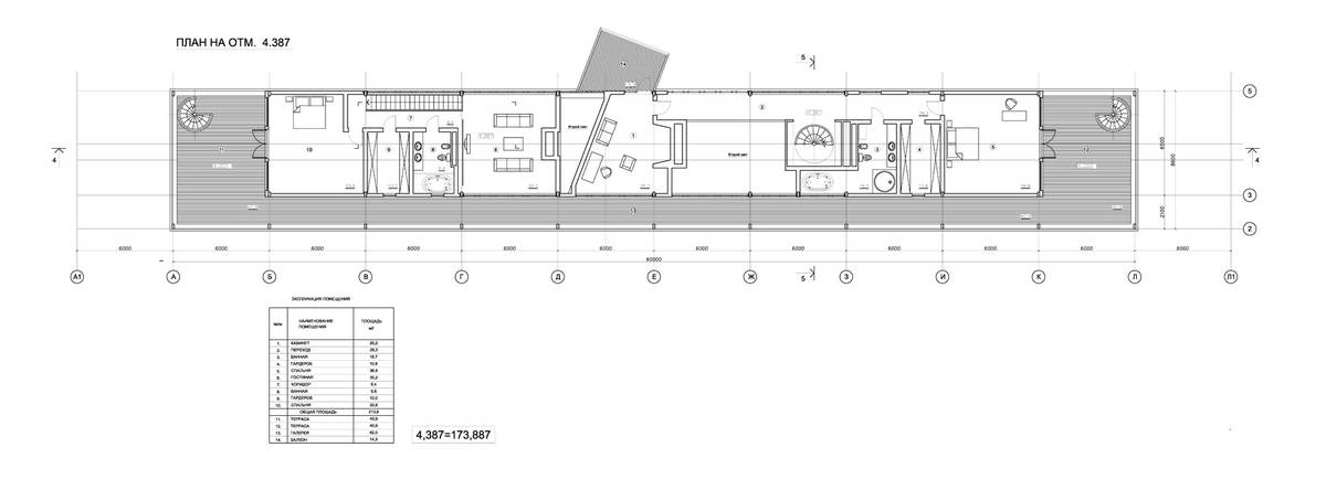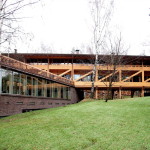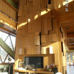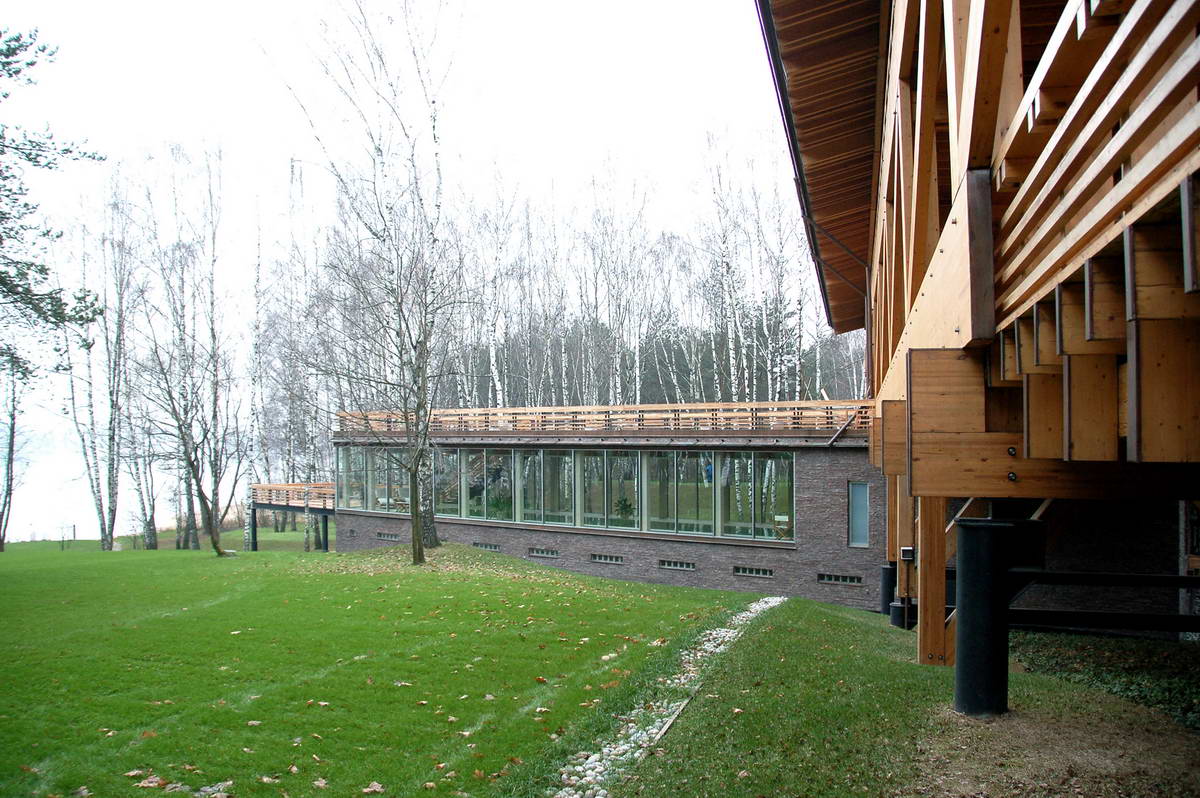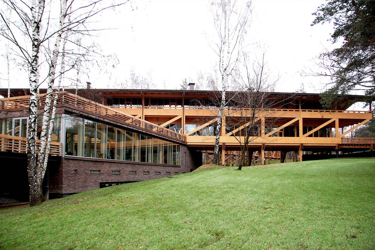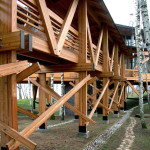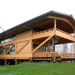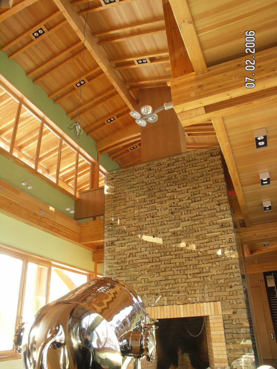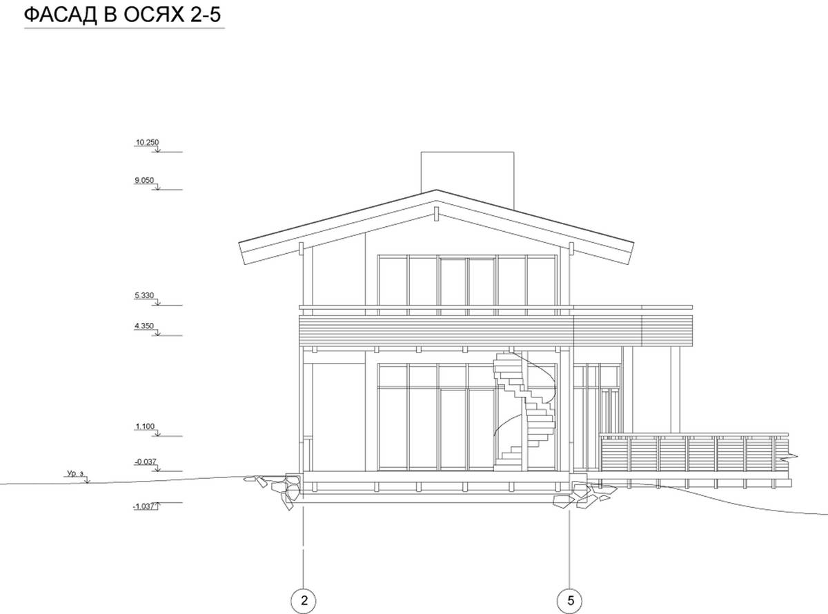 Одна часть дома, верхняя, представляет собой стоечно-балочную схему из клееной древесины лиственницы. Опорой деревянным стойкам служат фундаменты на буронабивных сваях. Шаг стоек по буквенным осям – 6,0 м, по цифровым – 6,5 м и 2,1 м. Общие габариты этой части дома с учётом террас – 60,0х8,6м. Наружные стены – каркас из доски с заполнением минераловатным утеплителем и навесными щитами из клееной лиственницы в качестве наружной отделки. Кровля из доски лиственницы по наслонным клееным стропилам тоже из лиственницы.