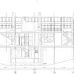 В основную, жилую часть дома с улицы можно попасть по длинному пешеходному крытому мостику-галерее. Эта часть дома разделена на три зоны, которые также подчёркиваются коммуникационными связями. Это гостевая зона, состоящая из 2 равноценных блоков, расположенных на 1 и 2 уровнях, один под другим, и включающих в себя небольшую гостиную, ванную комнату, гардеробную и спальню. Зона общего пользования, включающая прихожую с гардеробом, гостевой санузел, главную гостиную, столовую и кухню с выходом на террасу. Она занимает часть 1 уровня, соединена двухсветным пространством с кабинетом и галереей. Из неё так же можно попасть на большую открытую террасу, которая совмещена с эксплуатируемой кровлей второго, нижнего объёма. И третья зона – это приватная зона, в которую можно попасть по отдельной лестнице из главной гостиной. В ней расположены ванная комната, гардеробная комната и сама спальня хозяев. Все помещения дома связаны между собой галереями, проходящими снаружи на 1 и 2 уровнях. Общая площадь жилой части дома 505м. кв. без учёта террас и галерей.
