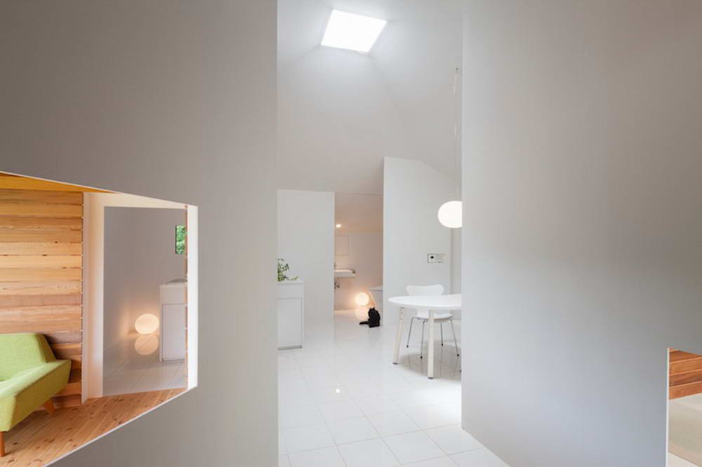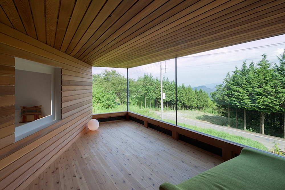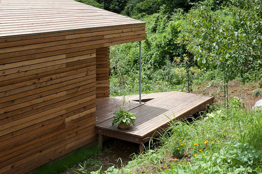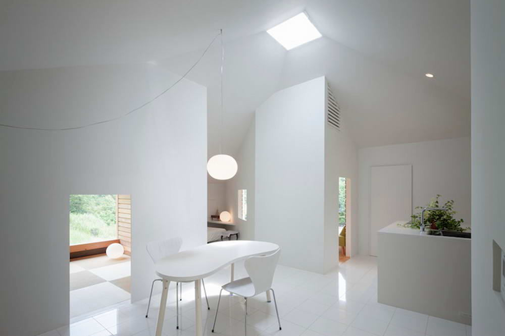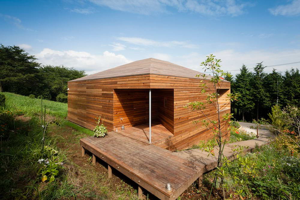 Этот небольшой деревянный дом построен в середине живописного склона. У него квадратный план и простая, слегка грубоватая форма в цельной деревянной оболочке с шатровой крышей, смягчённая нишами и срезанной верхушкой крыши, где устроено зенитное окно. Четыре выреза в объёме образуют промежуточные пространства, связывающие интерьер и внешний мир. В них расположены открытые и остеклённые террасы, куда выходят все окна дома. План дома резко контрастирует с простым объёмом — у него сложная форма и цельное, перетекающее пространство без дверей, выкрашенное в радикально белый цвет.