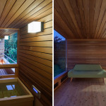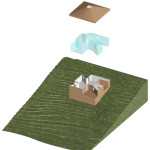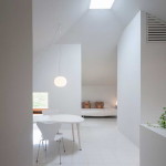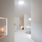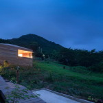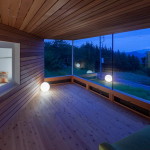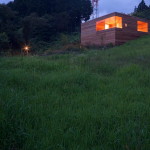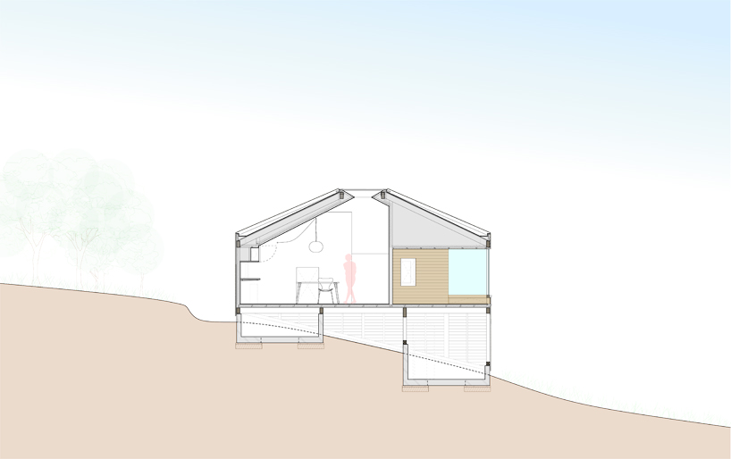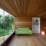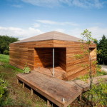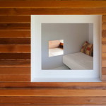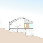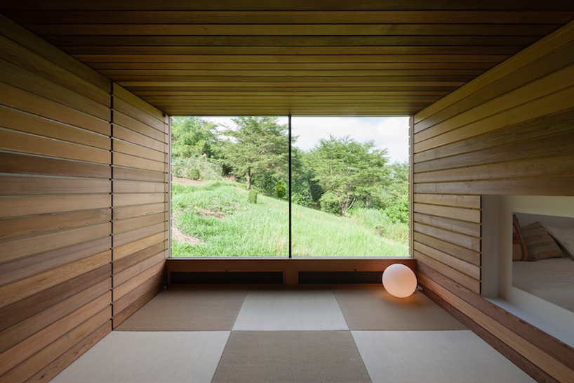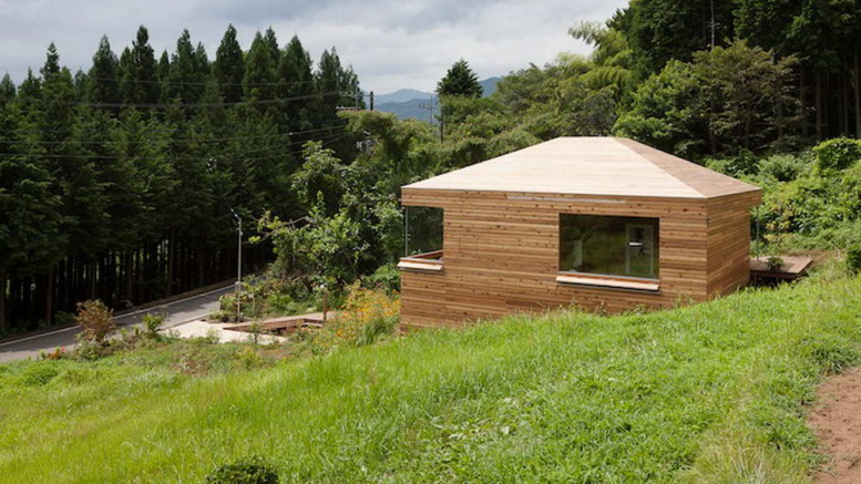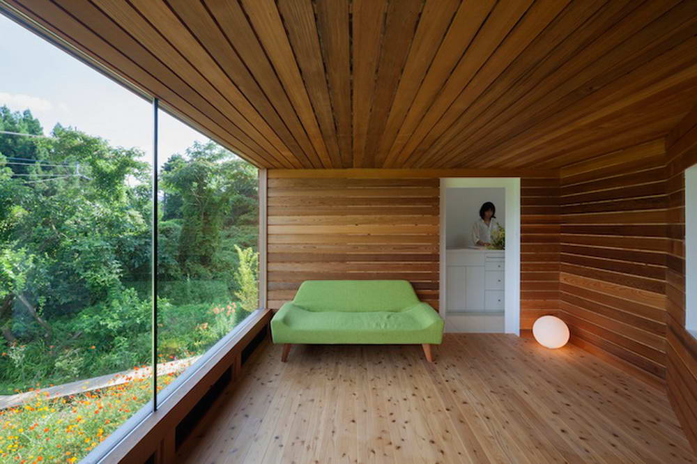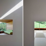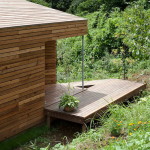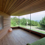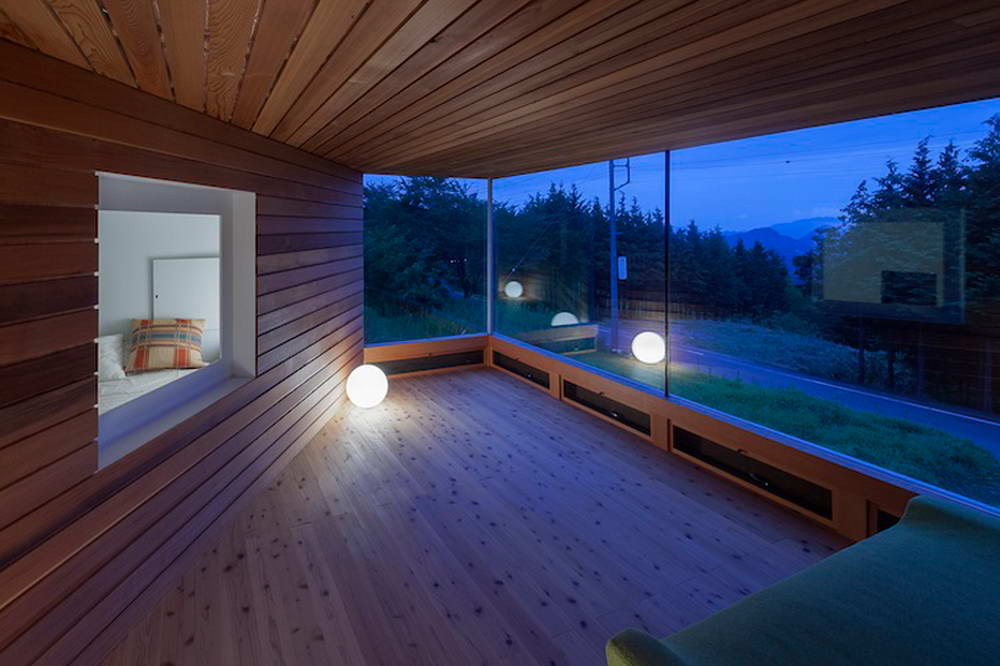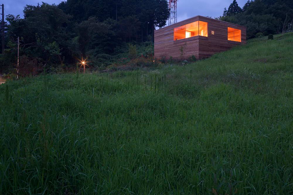 Этот небольшой деревянный дом построен в середине живописного склона. У него квадратный план и простая, слегка грубоватая форма в цельной деревянной оболочке с шатровой крышей, смягчённая нишами и срезанной верхушкой крыши, где устроено зенитное окно. Четыре выреза в объёме образуют промежуточные пространства, связывающие интерьер и внешний мир. В них расположены открытые и остеклённые террасы, куда выходят все окна дома. План дома резко контрастирует с простым объёмом — у него сложная форма и цельное, перетекающее пространство без дверей, выкрашенное в радикально белый цвет.