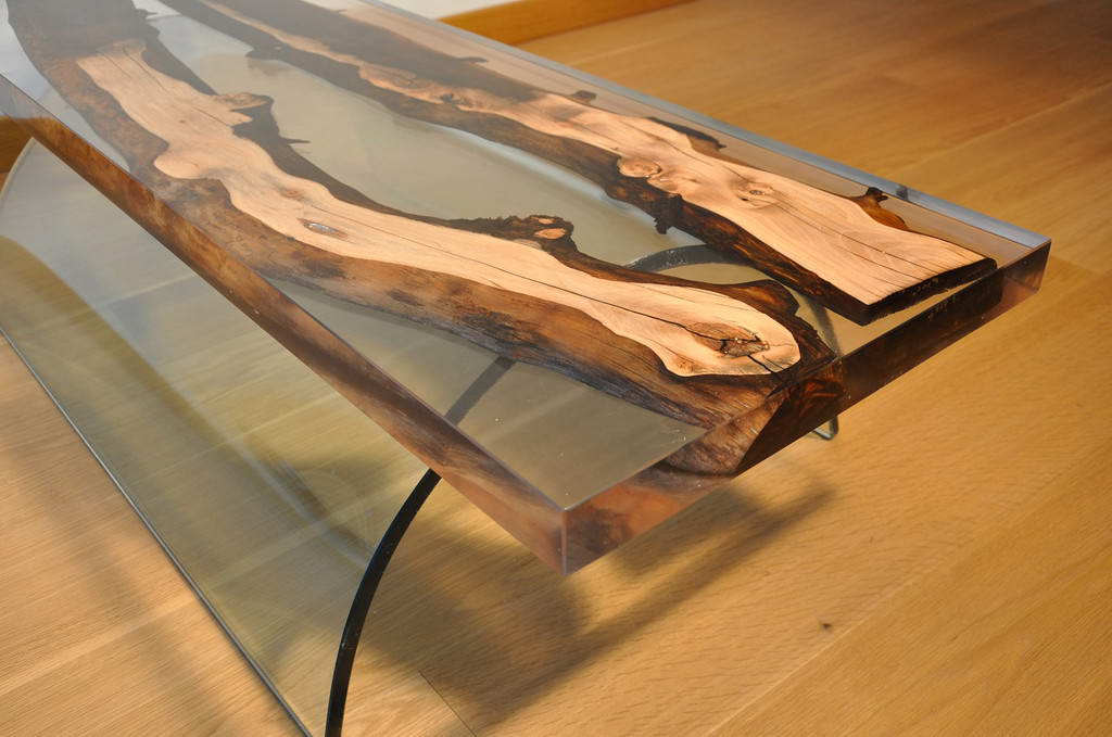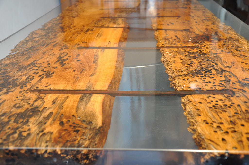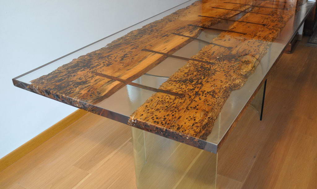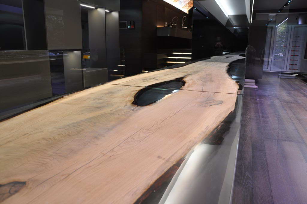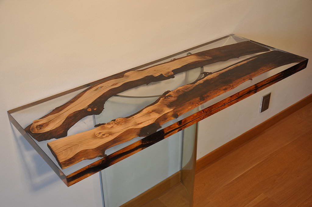 Особенностью дизайна является сочетание деревянной текстуры из венецианского «брикколе» и оболочки из прозрачной эпоксидной смолы.