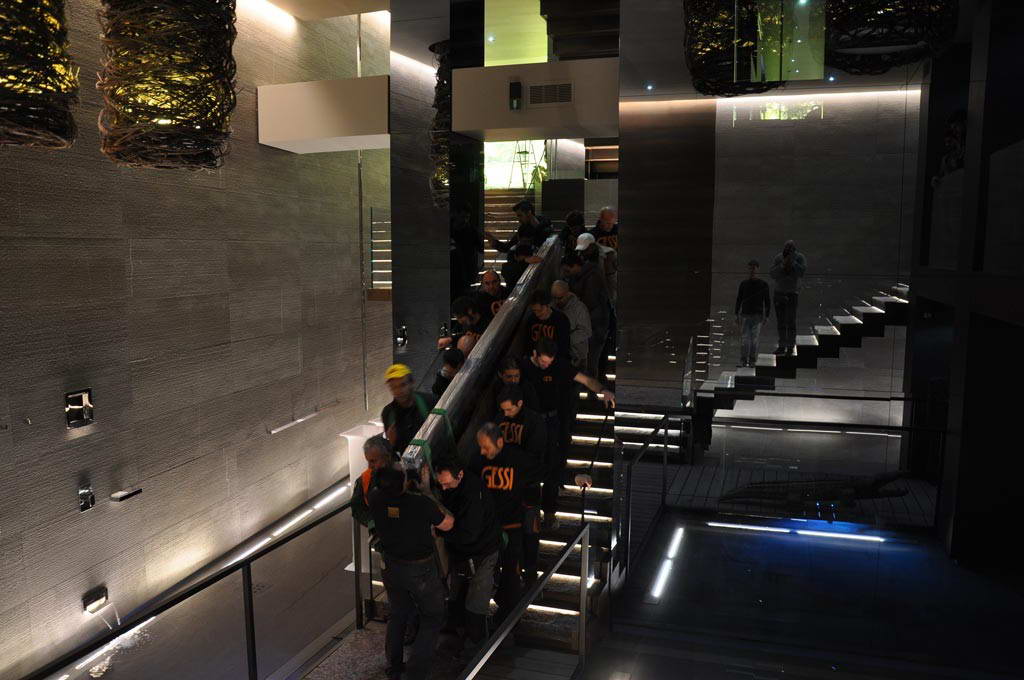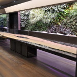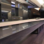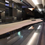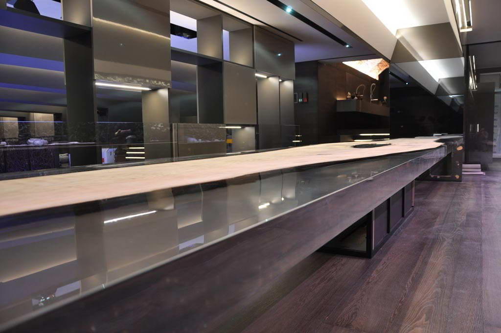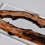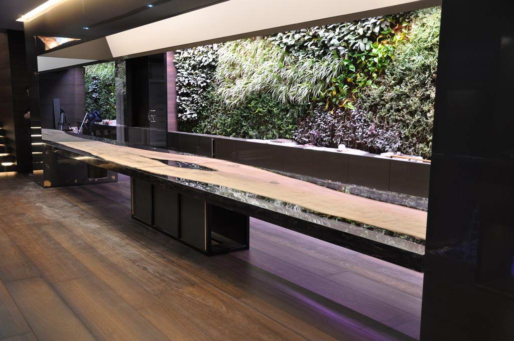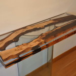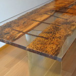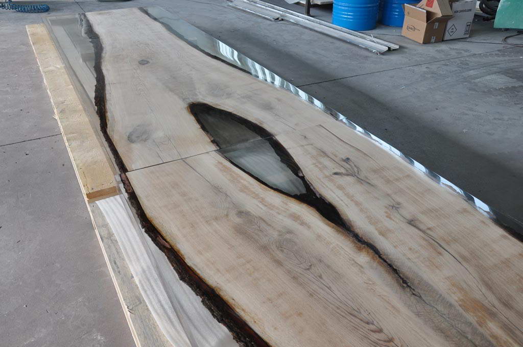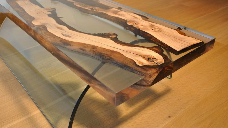 Особенностью дизайна является сочетание деревянной текстуры из венецианского «брикколе» и оболочки из прозрачной эпоксидной смолы.