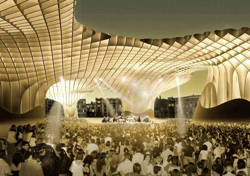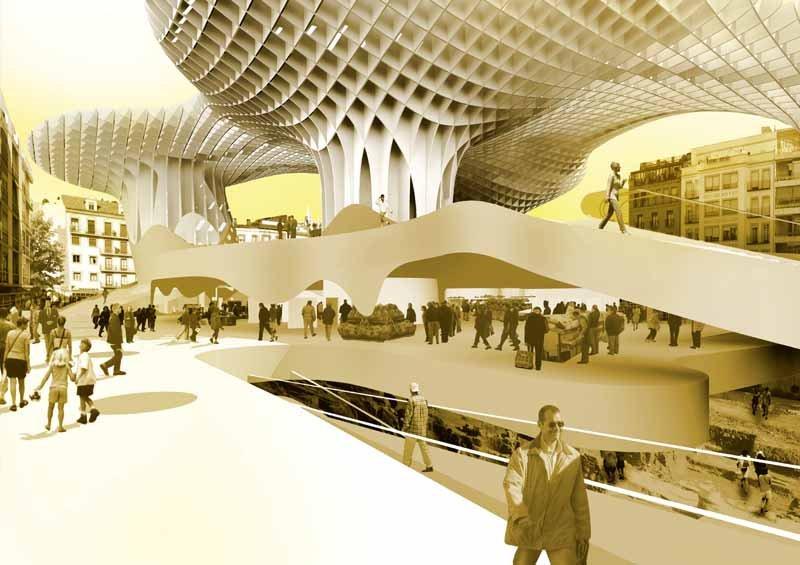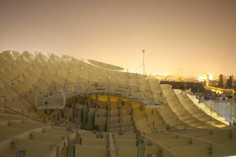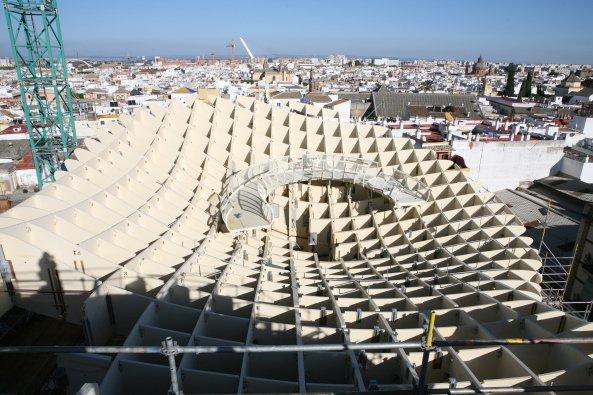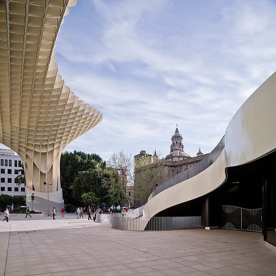 Metropol Parasol привлекает своим необычным видом – словно гигантские зонтики, раскинулся он над площадью, и под его крышей, напоминающей соты, можно укрыться от палящего солнца. Деревянная крыша сооружения поднята над землей на высоту 28 метров, она держится на бетонных столбах, ее длина – 175 метров, а ширина – 75. «Зонтик» удваивает общественное пространство площади Энкарнасьон: кроме затененной зоны на уровне земли он предоставляет горожанам 4500 м2 своей верхней поверхности с кафе и смотровой платформой.