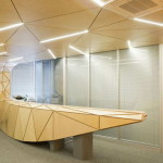 Фронт-деск офиса выполнен из многослойной фанеры, разбитой на треугольные фрагменты с каньонами соединительных линий, плавной линией стекающих с потолка, переходящих в стойку ресепшена.