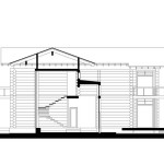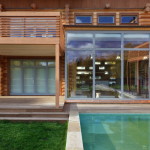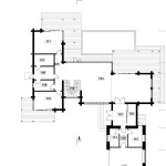 В плане дом представляет собой довольно сложную фигуру – положенную на бок букву «Г», которая образована прямоугольниками разных по площади назначению помещений. Центральным пространством первого этажа, как и хотел заказчик, становится огромная гостиная-столовая, через которую можно попасть в кабинет, гостевую комнату, сауну, а также на лестницу, ведущую на второй этаж. Верхний уровень отведен под личные помещения хозяев – спальню, гардеробную, детскую, а также бильярдную и библиотеку. К длинной перекладине буквы «Г», ориентированной по оси восток-запад, присоединен еще один перпендикулярный «хвостик» – гараж и объединяющая два объема входная зона. Крыльцо и аппендикс гаража обращены на север, а большая часть внутренних помещений ориентирована на южную сторону, с которой архитекторы пристраивают к дому несколько больших террас, а между ними вписывают открытый бассейн.