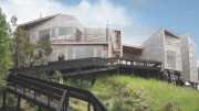 Сам дом представляет из себя композицию из нескольких деревянных объёмов, закрытых со стороны соседних строений и открытых в сторону площадки и леса.