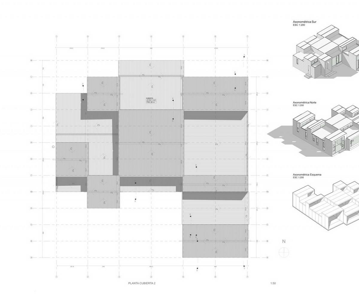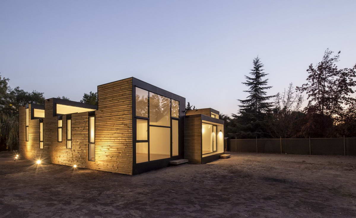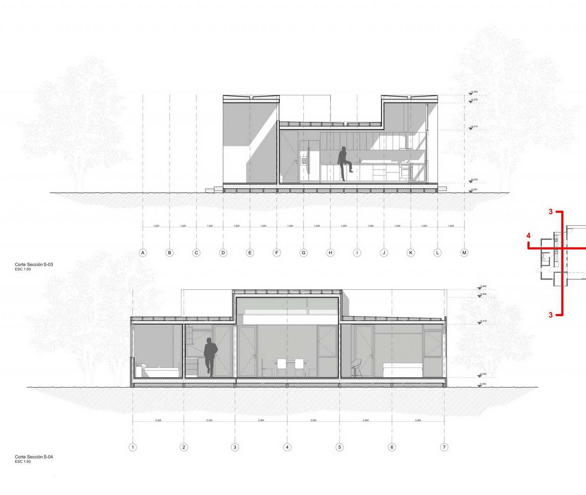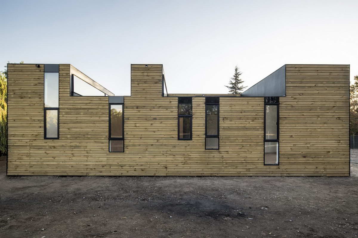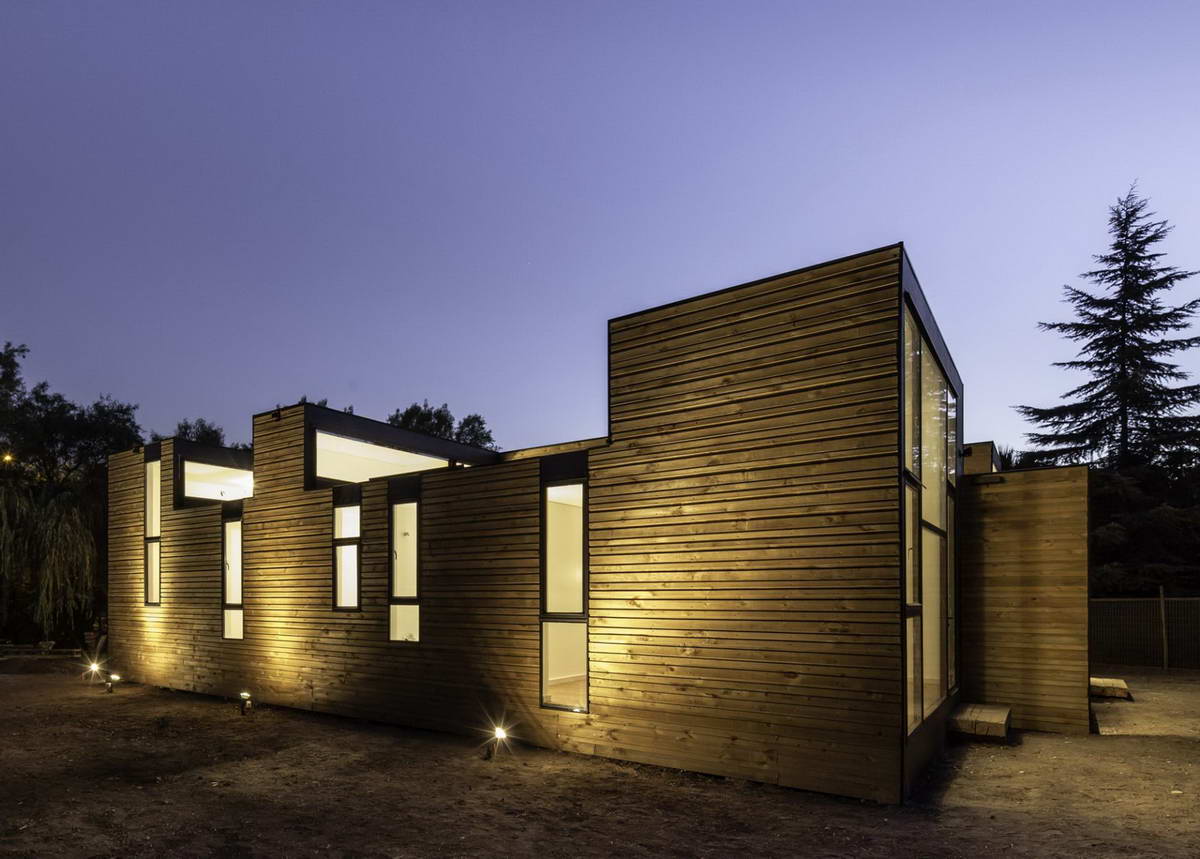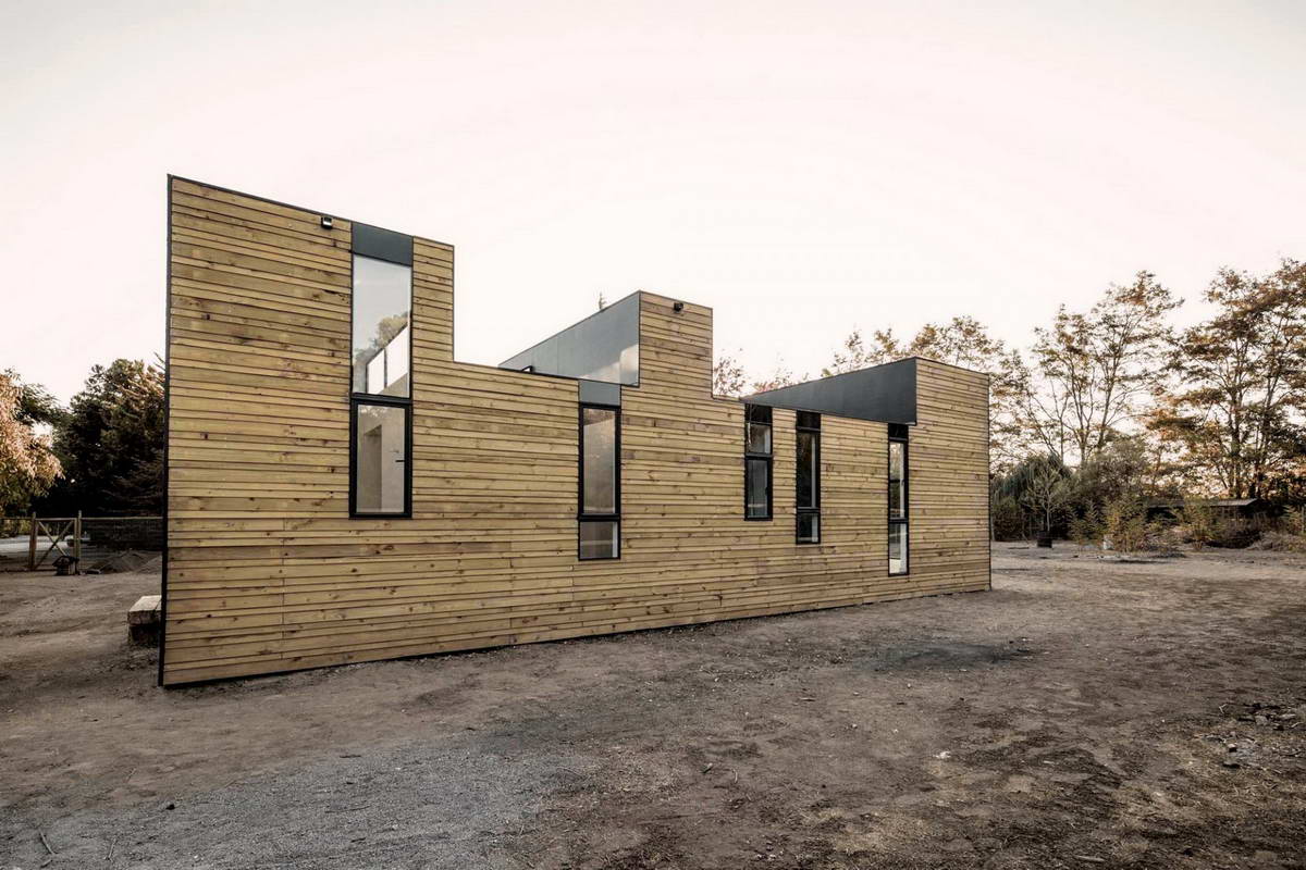 Это одноэтажный дом с плоской крышей. При проектировании архитекторы исходили из возможностей и стандартов производственной компании, изготавливающей деревянные конструкции. В результате появились два модуля по ширине (2,44 и 4,88 метра) и два по высоте. В плане это выразилось в четырёх параллельных «проходах» — в узких блоках расположены сантехнические помещения и кухня, в широких — общая комната со столовой и три спальни. Чередование низких и высоких блоков придаёт эффектный ритм всему зданию, а также увеличивает кубатуру помещений и добавляет верхнее естественное освещение.
