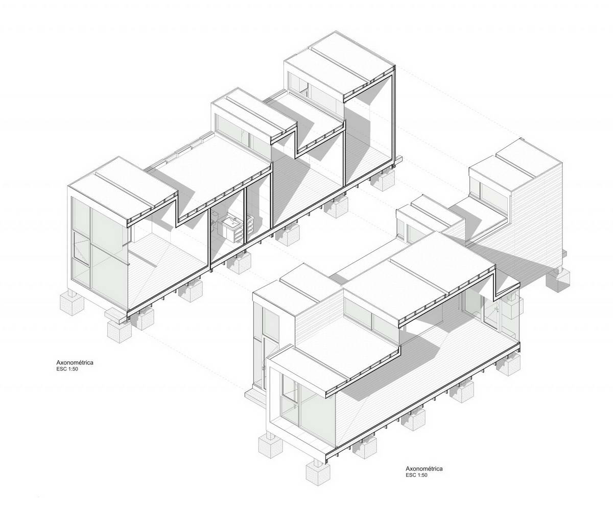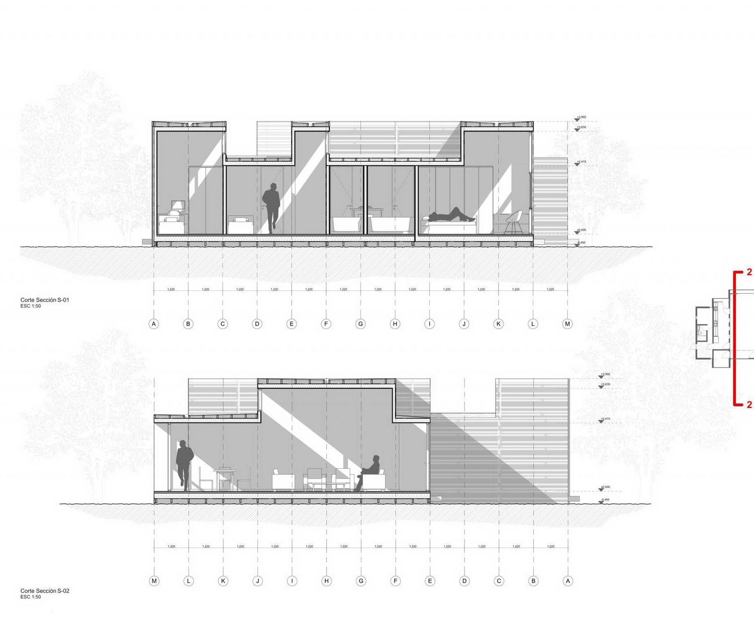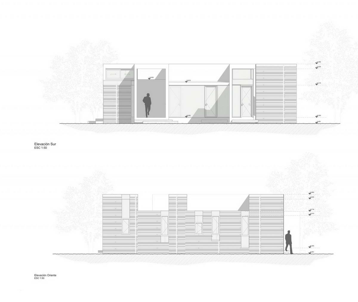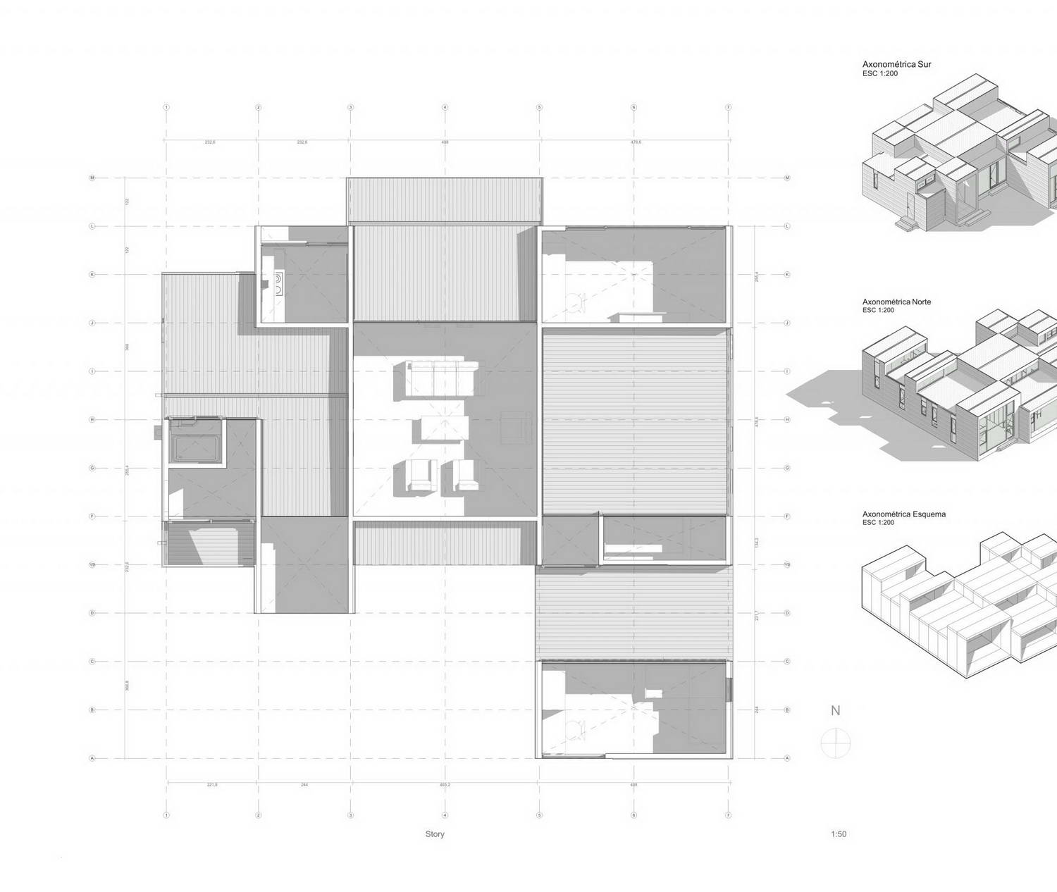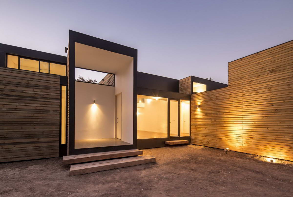 Это одноэтажный дом с плоской крышей. При проектировании архитекторы исходили из возможностей и стандартов производственной компании, изготавливающей деревянные конструкции. В результате появились два модуля по ширине (2,44 и 4,88 метра) и два по высоте. В плане это выразилось в четырёх параллельных «проходах» — в узких блоках расположены сантехнические помещения и кухня, в широких — общая комната со столовой и три спальни. Чередование низких и высоких блоков придаёт эффектный ритм всему зданию, а также увеличивает кубатуру помещений и добавляет верхнее естественное освещение.
