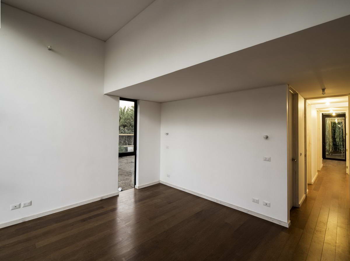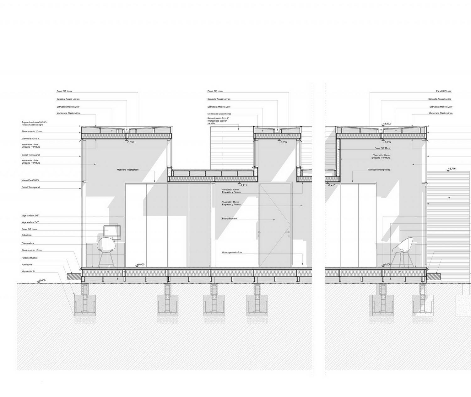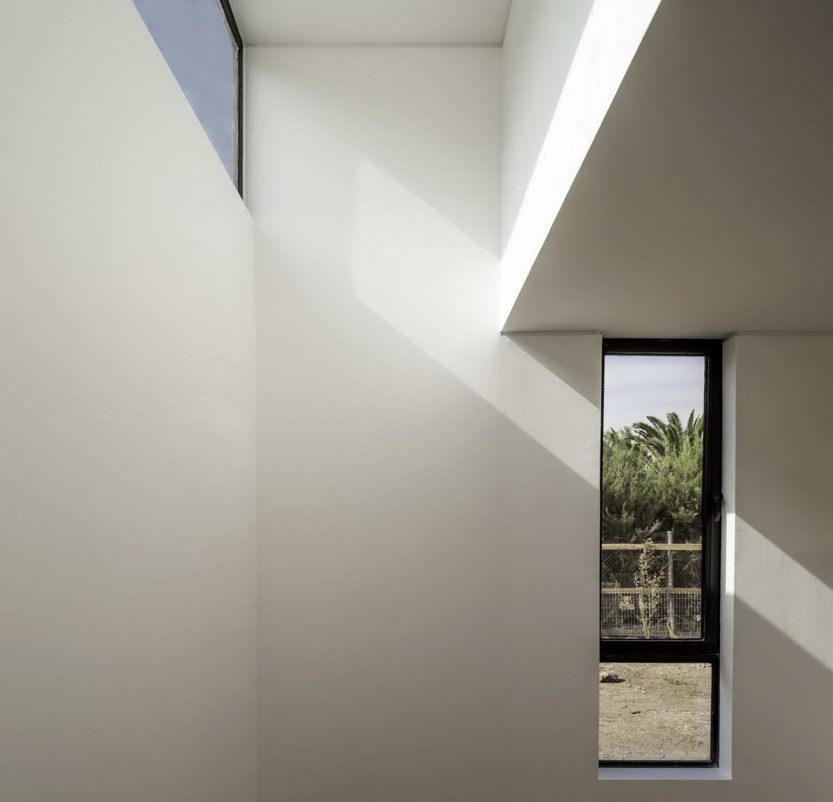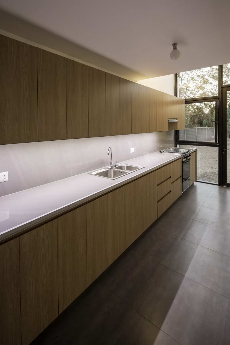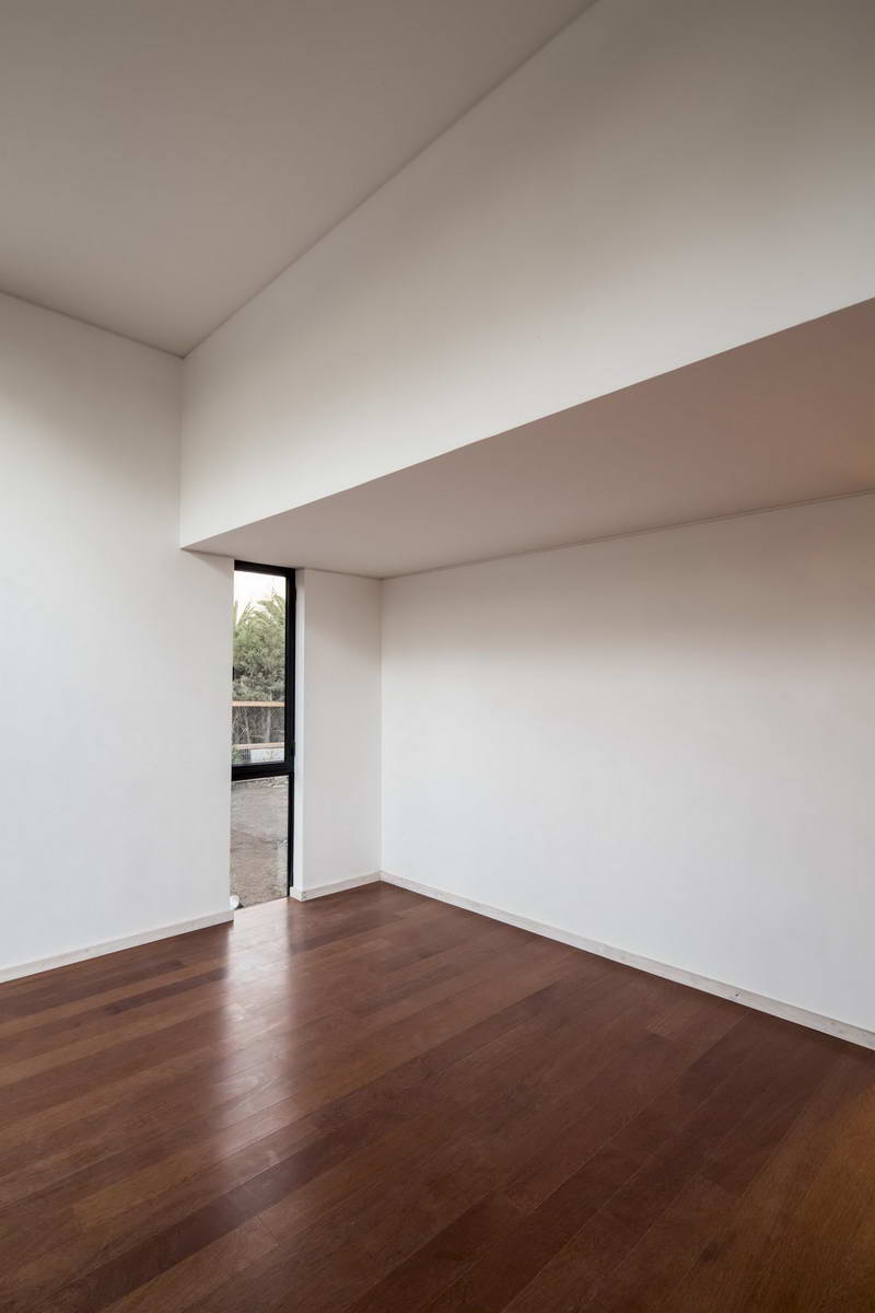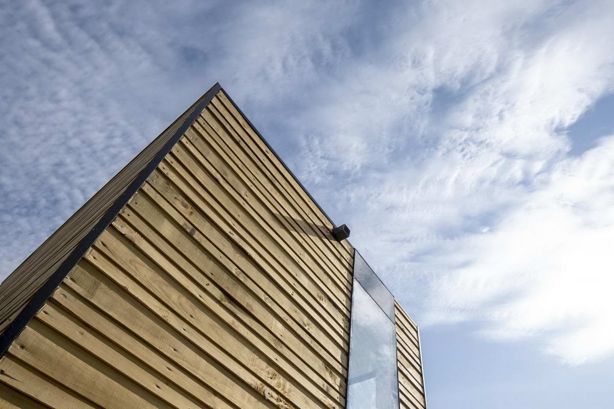 Это одноэтажный дом с плоской крышей. При проектировании архитекторы исходили из возможностей и стандартов производственной компании, изготавливающей деревянные конструкции. В результате появились два модуля по ширине (2,44 и 4,88 метра) и два по высоте. В плане это выразилось в четырёх параллельных «проходах» — в узких блоках расположены сантехнические помещения и кухня, в широких — общая комната со столовой и три спальни. Чередование низких и высоких блоков придаёт эффектный ритм всему зданию, а также увеличивает кубатуру помещений и добавляет верхнее естественное освещение.