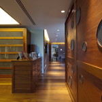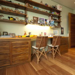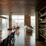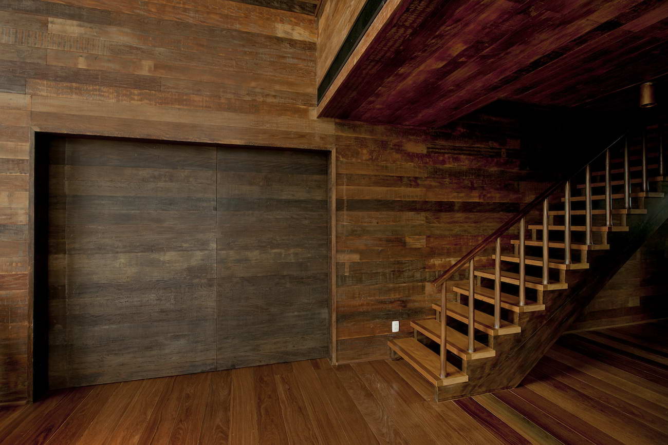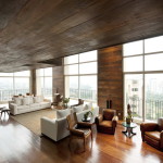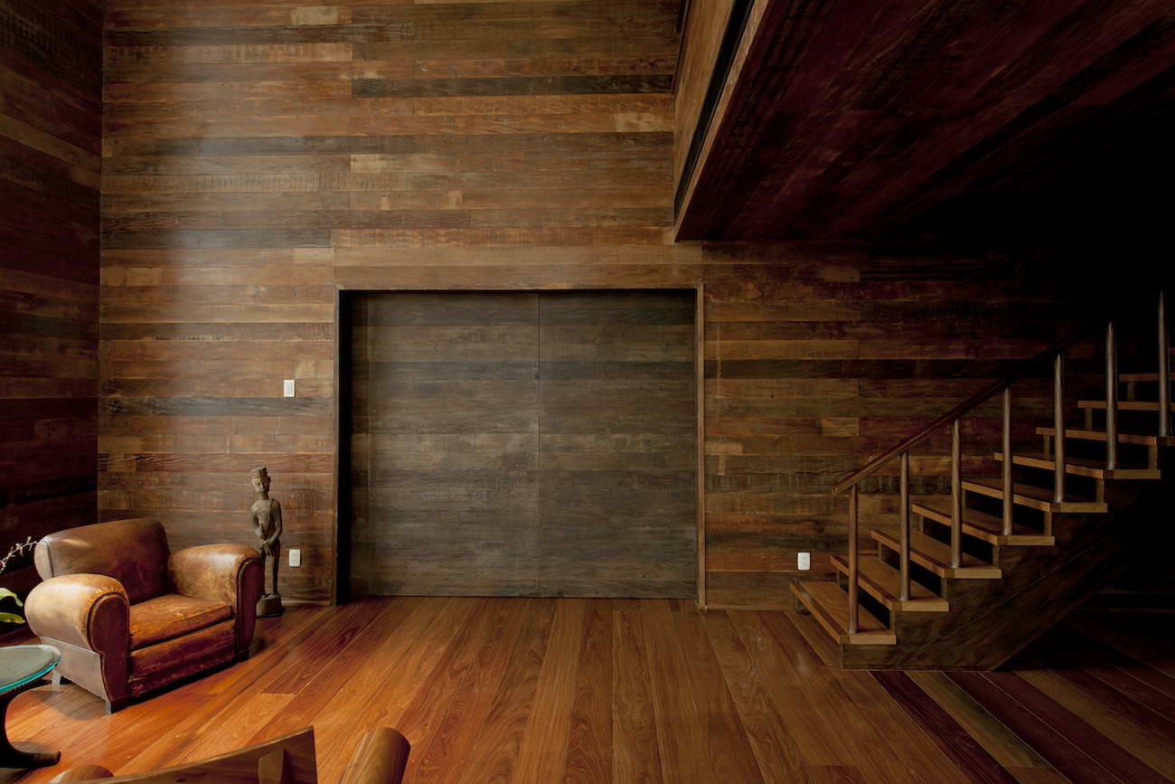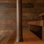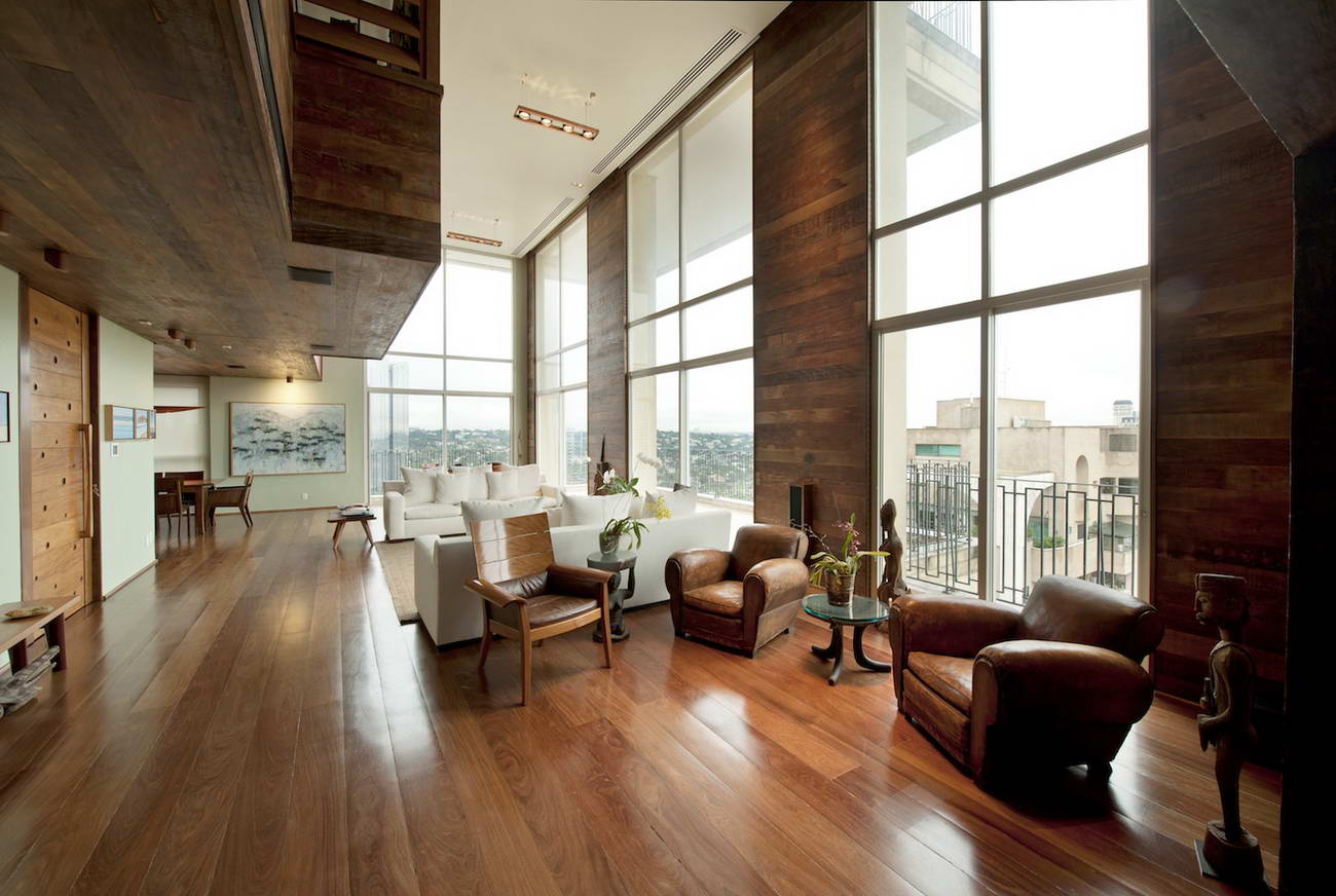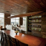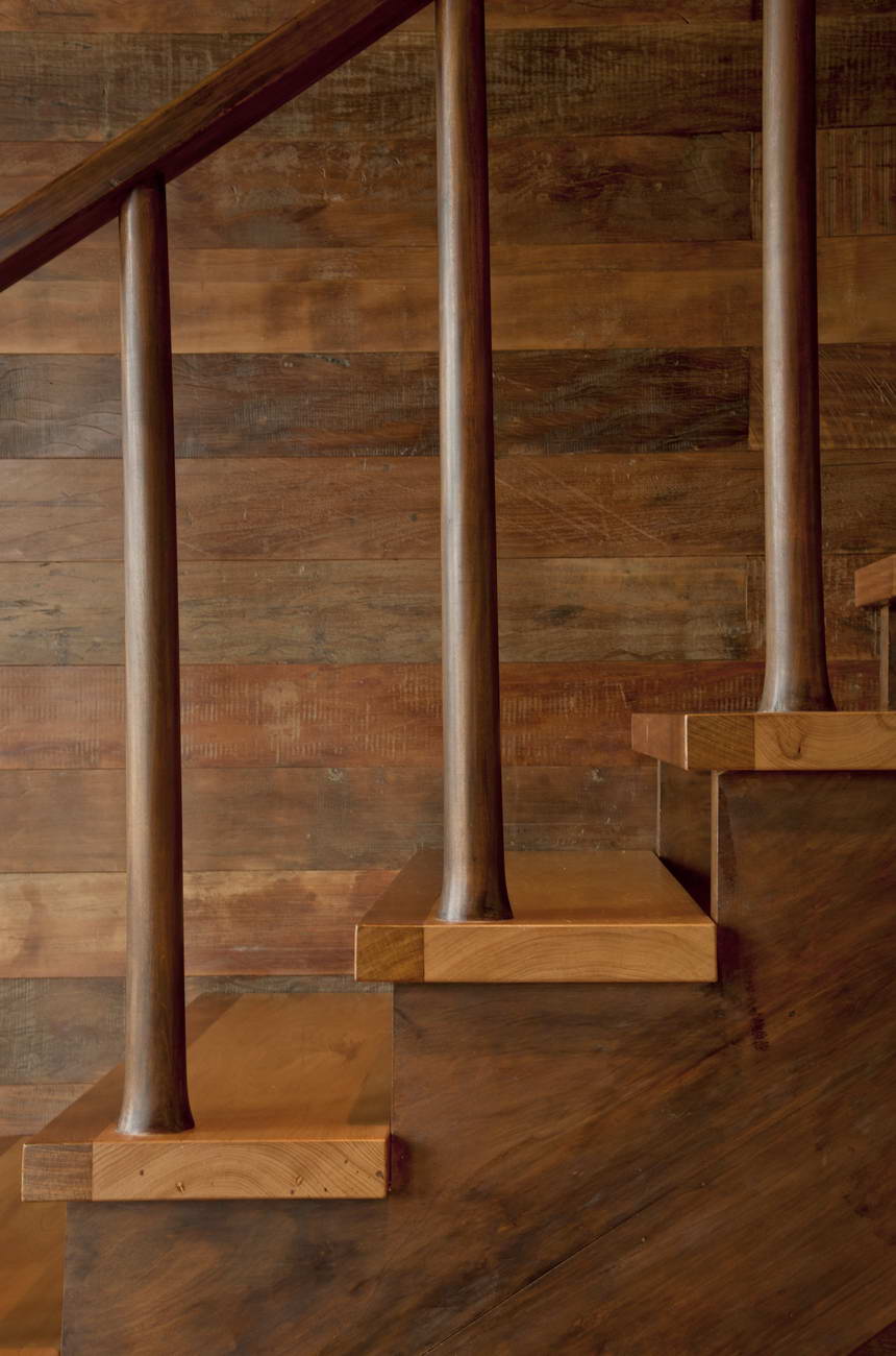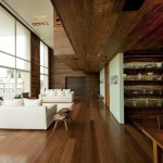 Использованы различные сорта местных пород, с преобладанием тёмных тонов, что делает интерьер невероятно богатым и уютным, заставляя забыть о том, что находишься в центре многомиллионого города.