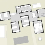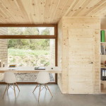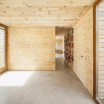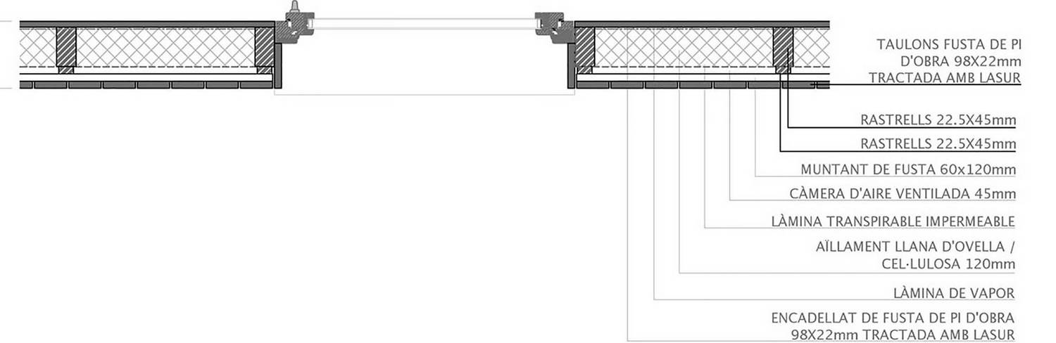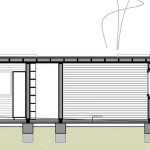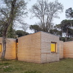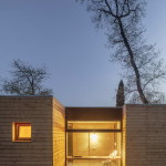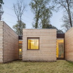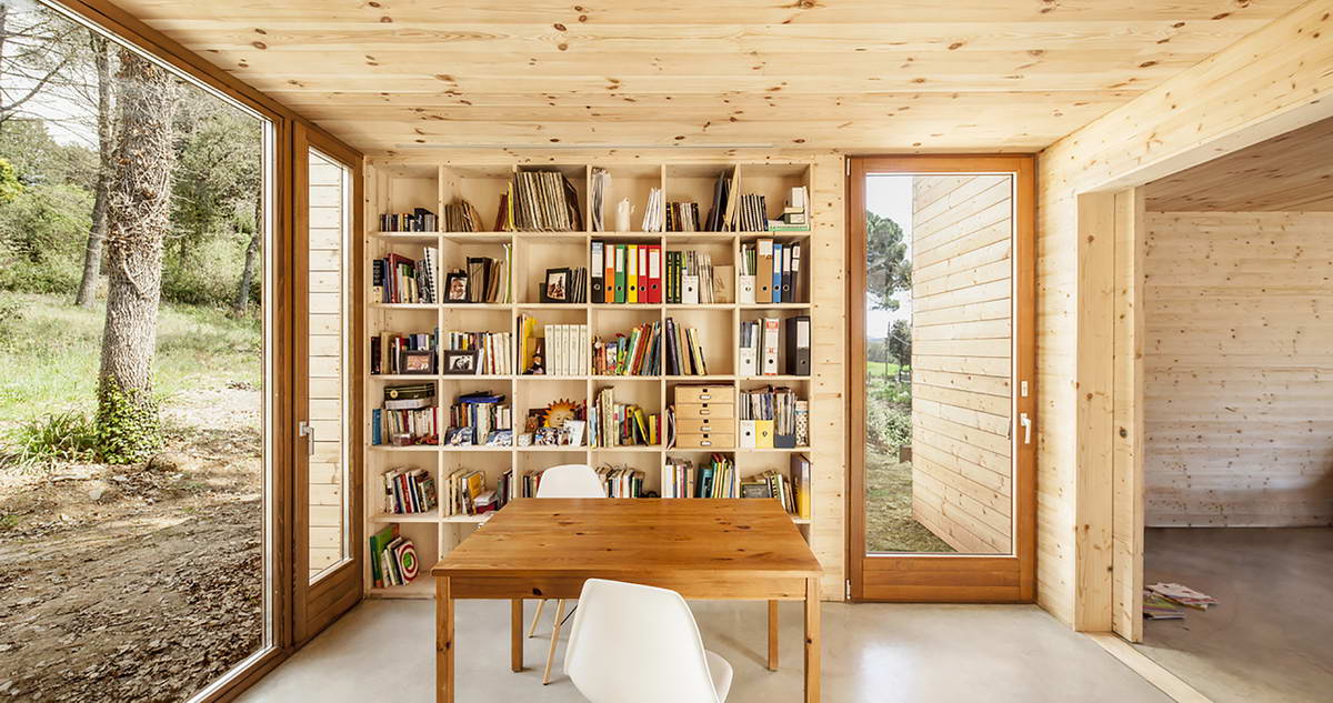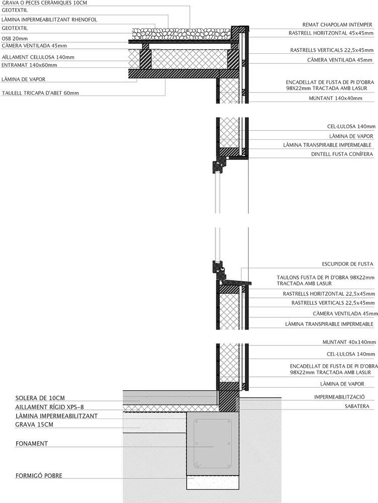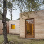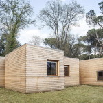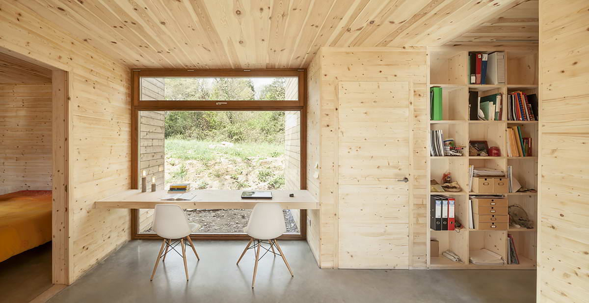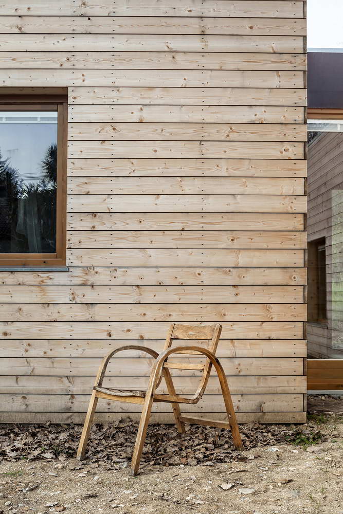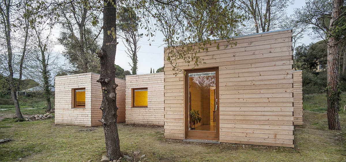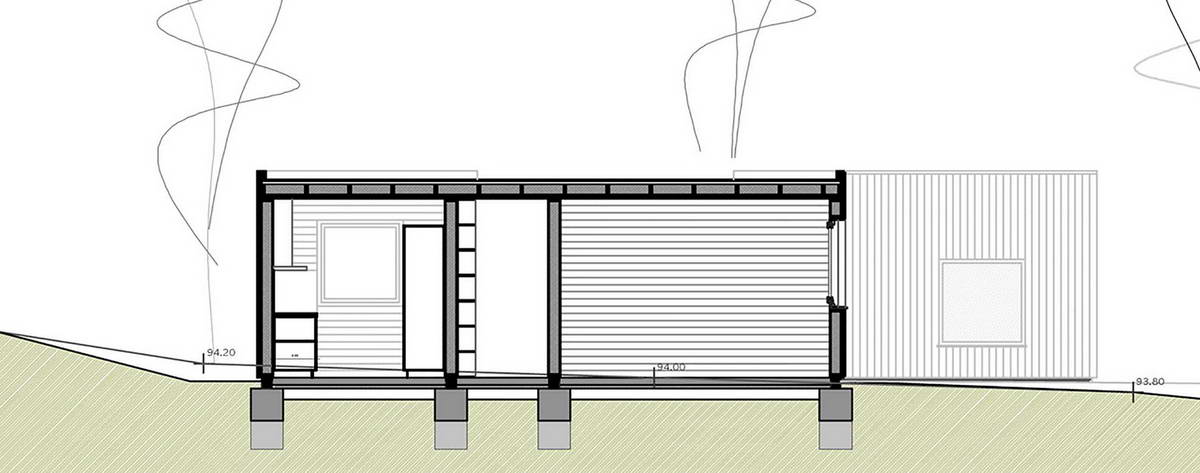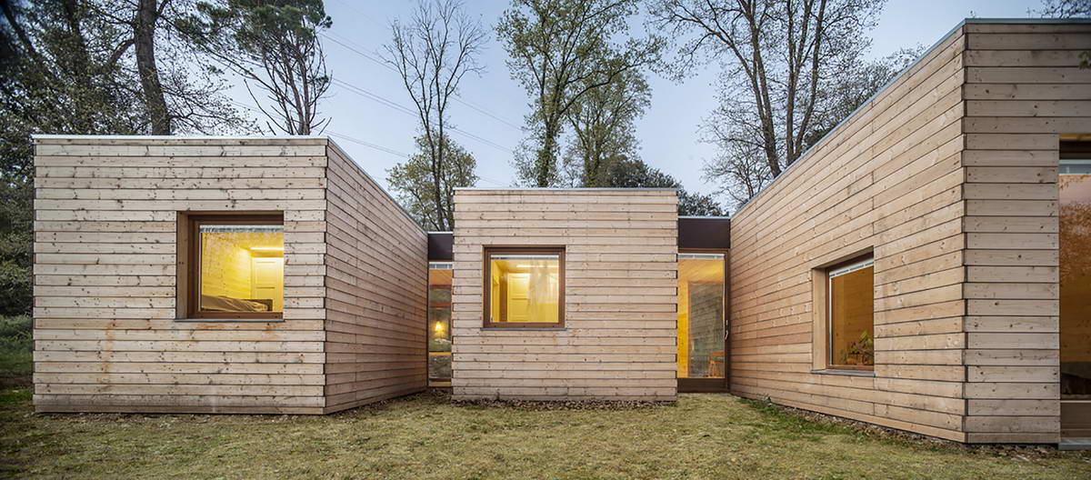 Основу дома составляют быстровозводимые деревянные модульные конструкции, которые не требуют дополнительной отделки и являются достаточно гибкими, чтобы легко адаптироваться к морфологии участка. Все в нём шесть модулей: три спальни, общая комната, кухня с санузлом и складской блок. Дополнительные пространства сформированы за счёт промежутков между ними. Дом одноэтажный, с плоской крышей и деревянным каркасом.