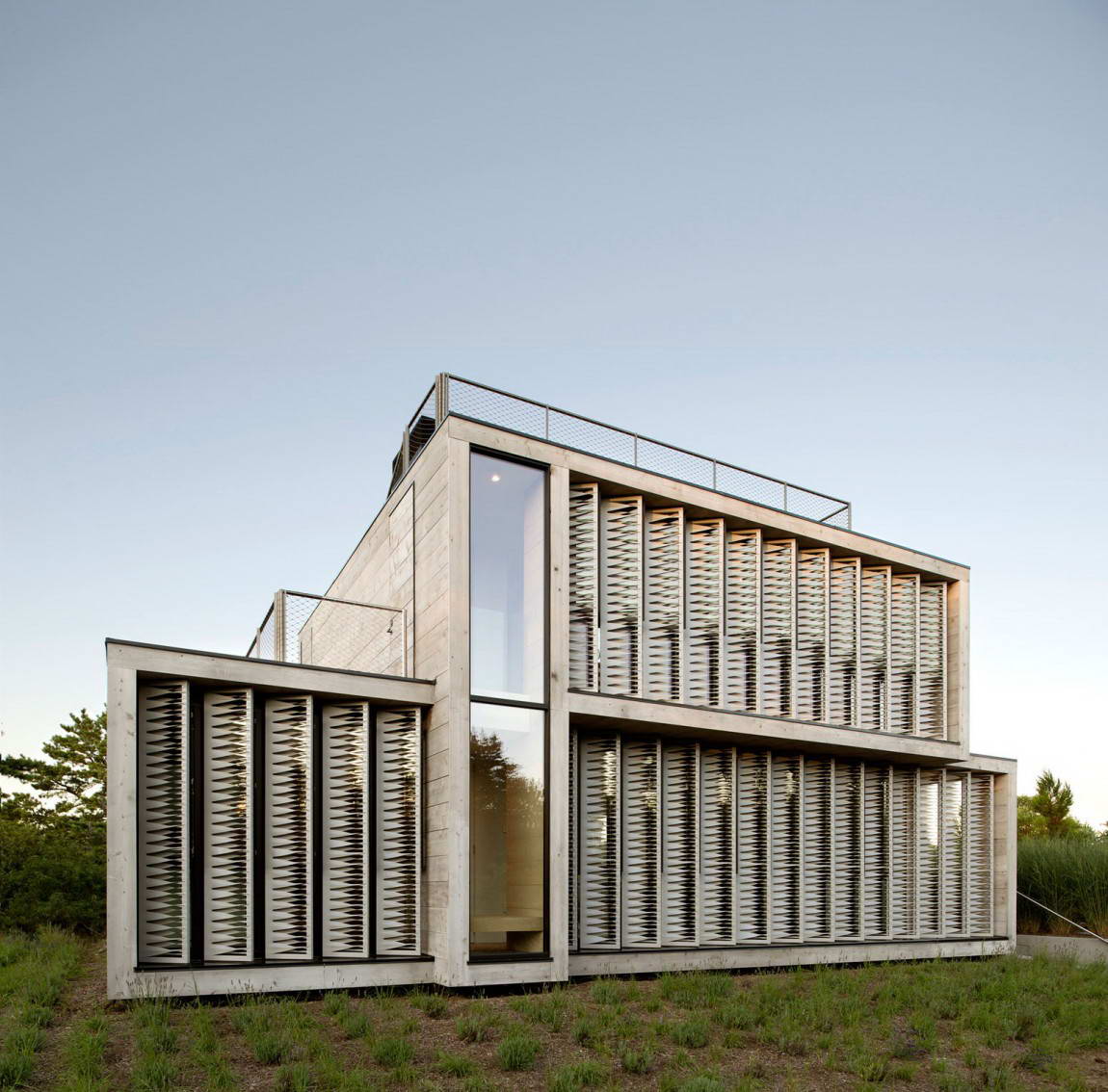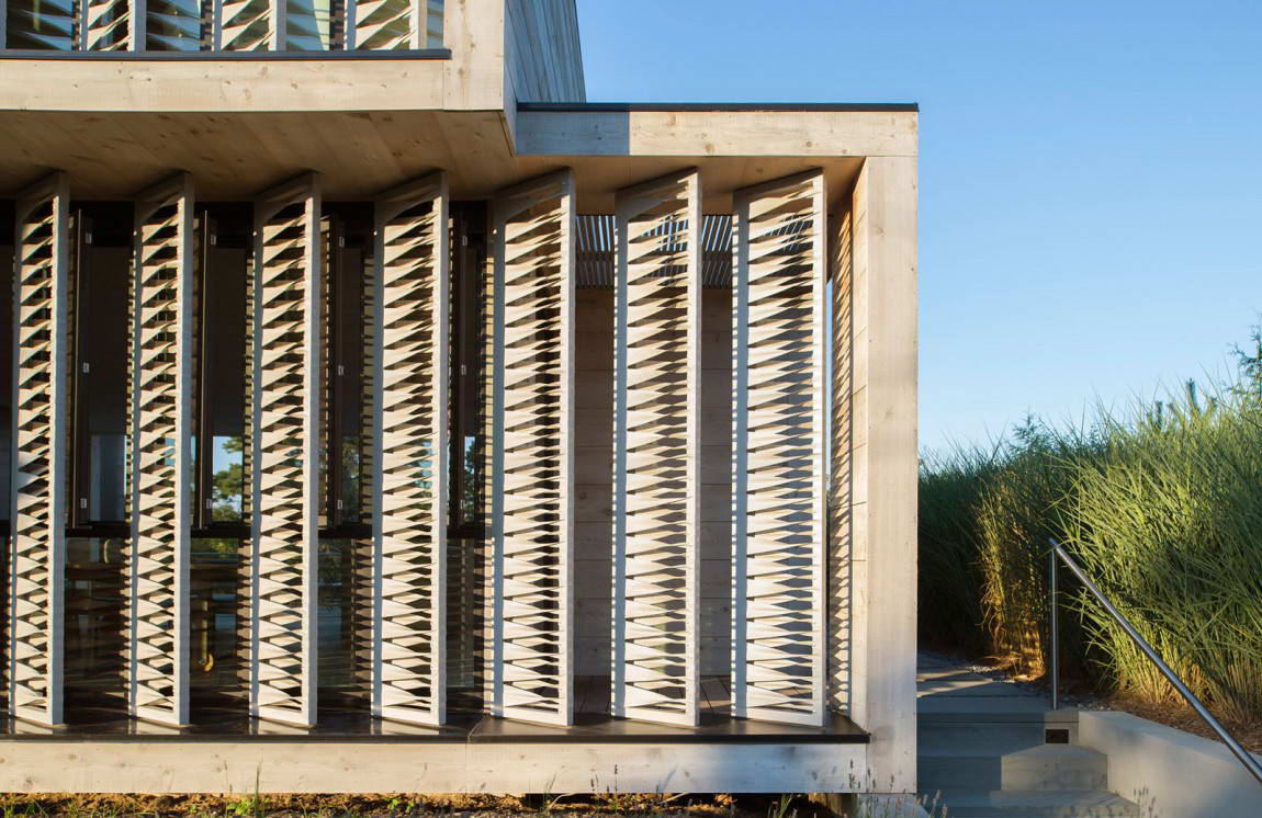 Окружающий ландшафт сформировался в течение десятков лет прибрежным ветром и микроклиматом. Дом ориентирован главным фасадом в сторону улицы, его архитектура учитывает розу ветров и движение солнца, у него два этажа и плоская крыша. Внизу находится большая гостиная с кухней и открытой террасой и две спальни, наверху — ещё две спальни. С юго-западной стороны фасад защищают эффектные жалюзи из холста, закрывающие интерьер от летнего солнца и ветра и создавая различные пятнистые узоры света, изменяющиеся в течение всего дня. Кроме того, эти жалюзи являются частью пассивной вентиляции. В целом форма и детали дома являются следствием условий эксплуатации и привязывают дом к местности исходя их функциональных требований, а результатом является региональная архитектура, основанная не на стиле, а на факторах окружающей среды.